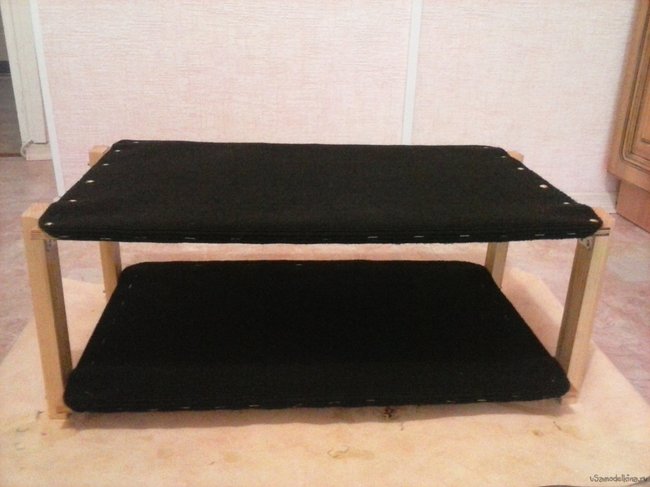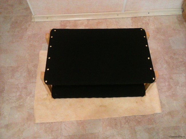 Нам понадобиться два куска фанеры, деревянный брусок, несколько мебельных уголков с болтами и гайками, материал для покрытия ( в качестве материала использовался 100 % ворсовый полипропилен, который предназначен для изготовления придверных и автомобильных ковриков. Размеры 40х60 см, стоимость в среднем 25 рублей). Из инструментов: ножовка, мебельный степлер, любой лак (подойдет самый дешевый), дрель.