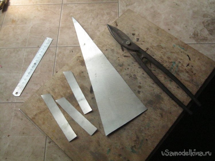 Фото 3. Заготовки для лепестков-креплений. Разметил их на обрезке оцинкованной кровельной стали 0,5 мм толщиной. Применил стальную линейку и слесарную чертилку. Вырезал полоски ножницами по металлу.