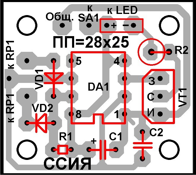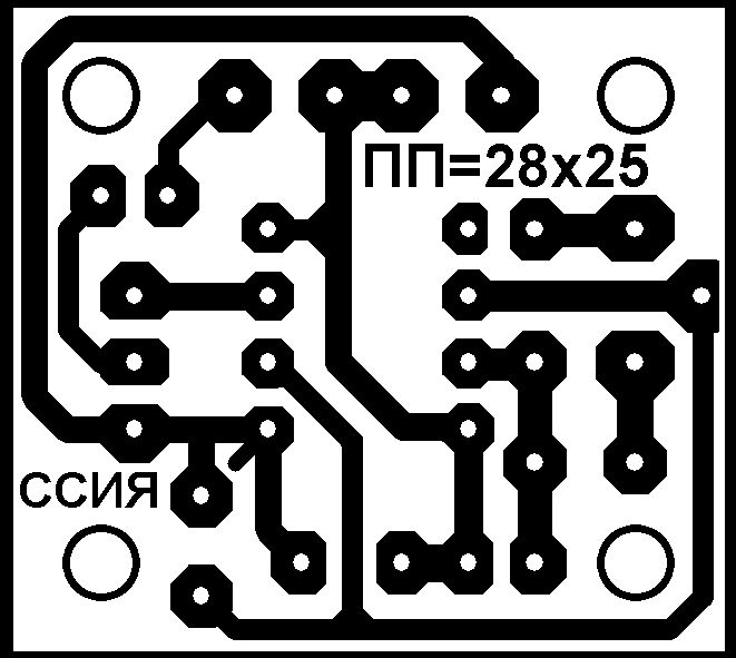 Печатная плата (далее просто ПП) ССИЯ выполнена из односторонне фольгированного стеклотекстолита размерами 28 х 25 х 1,5 мм (см. рисунки 2 и 3).