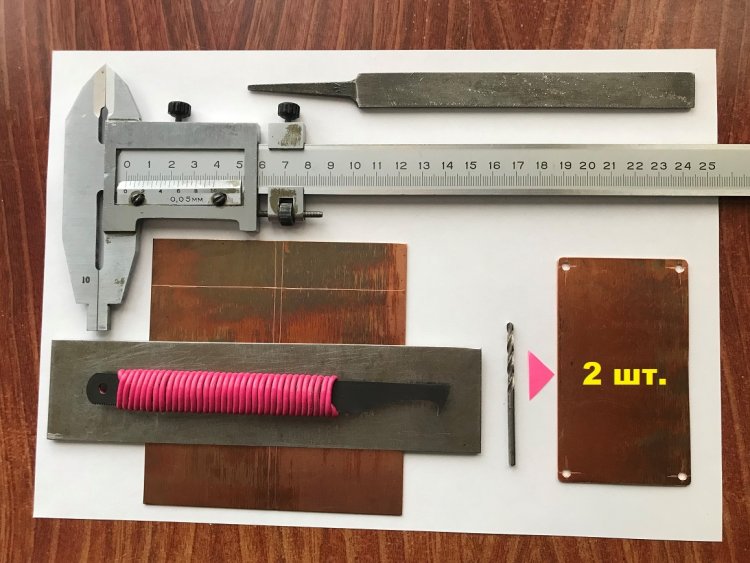Размеченный лист красной меди по вертикали разрезается резаком. Остальные четыре разреза автору поделки удалось быстро выполнить ножницами по металлу (без нежелательного изгиба поверхности листовых заготовок). При работе с ножницами по металлу следует остерегаться попадания части ладони между двумя концами ручек ножниц (справа от обмоток из красной и синей изоленты находятся травмоопасные для руки места ручек ножниц). Гематому на ладони неопытный «резчик» обычно получает в момент окончания вырезания платы (при «смыкании» ручек ножниц).