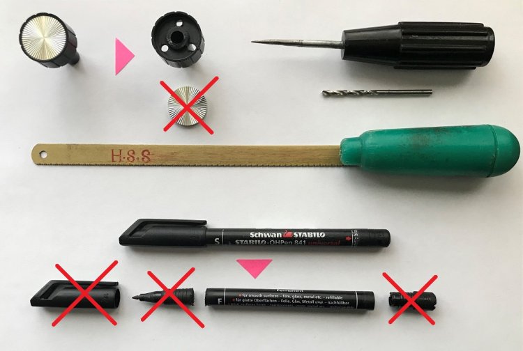 - Исписанный маркер SCHWAN STABILO «Белый лебедь». Например, Art No 841/46. Важно лишь, чтобы диаметр внутреннего отверстия был равен 6 мм.