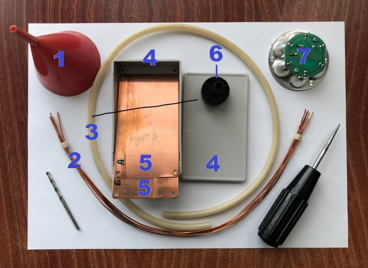 На рисунке 10 изображены: 1) воронка; 2) 6 проводников с двухслойной лаковой изоляцией (ПЭВ2); 3) ПВХ трубка (желательно не белого, а чёрного цвета); 4) корпус; 5) два (А и Б) металлических утяжелителя; 6) ручка; 7) LED - излучатель.