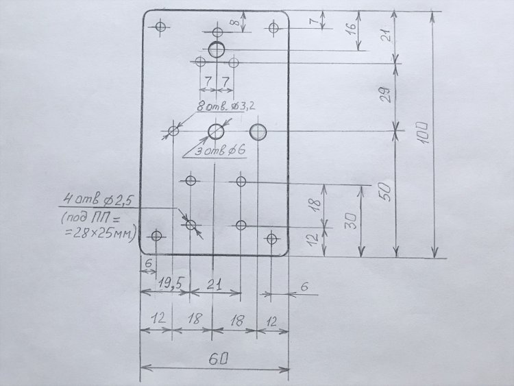В верхней крышке корпуса сверлятся и слегка зенкуются с обеих сторон 15 отверстий свёрлами d = 2,5; d = М3,2; d = М6. Четыре отверстия d = 2,5 мм делаются под винты 2,5 х 12 с потайными головками (заподлицо, под этикеткой 1).