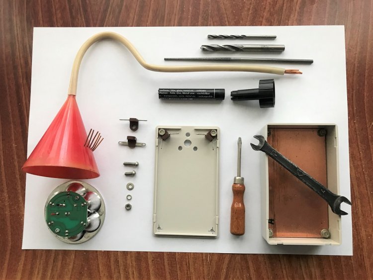 Для точного копирования поделки потребуются: 1) не рабочий (с потерявшим ёмкость аккумулятором) светодиодный фонарик; 2). Воронка с узким выходным горлышком; 3) ручка настройки от ламповой или транзисторной радиолы. Впрочем, можно взять за основу схему электрическую принципиальную (см. рисунок 1), а к изготовлению корпуса и излучателя подойти творчески (исходя из имеющихся комплектующих).