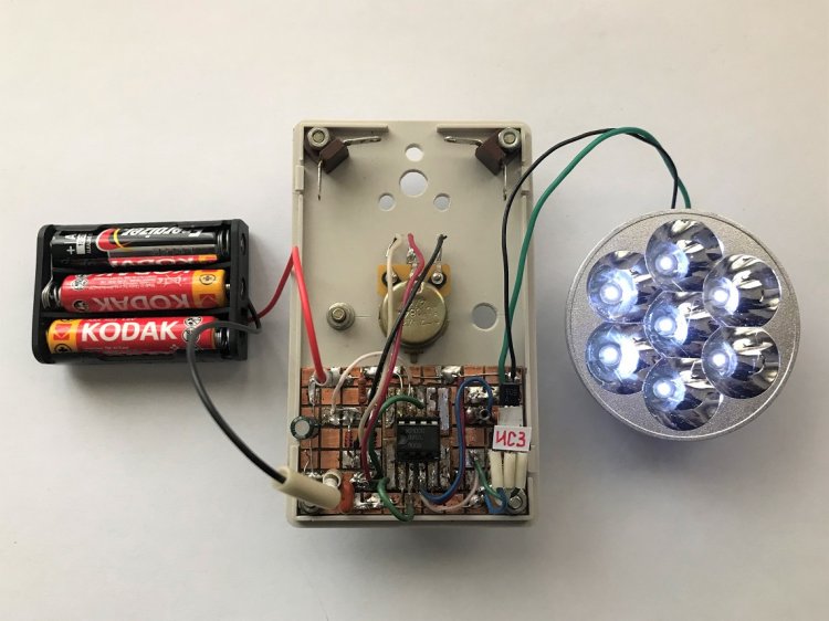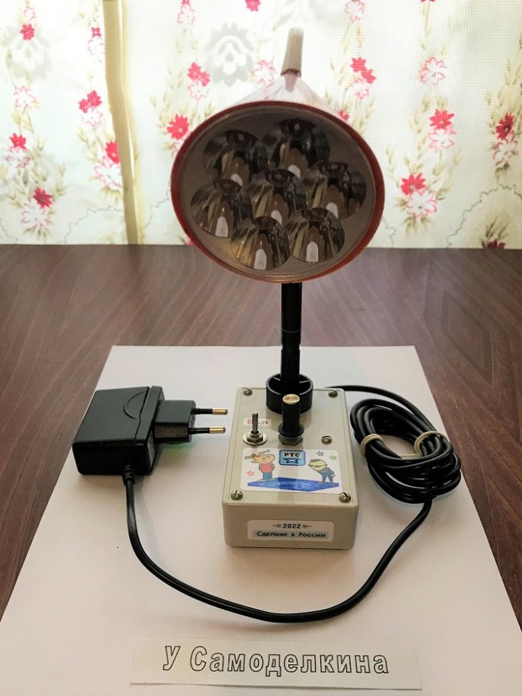 - Отслуживший LED фонарик (с потерявшим ёмкость аккумулятором), например, «Фотон» производства КНР. От фонаря берётся только плата с обозначением YUE1020, на которой расположены 7 белых светодиодов со встроенными отражателями и защитным декоративным стеклом.