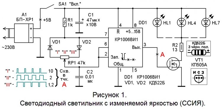 - диодов VD1 и VD2, формирующих диапазон изменения скважности совместно с потенциометром RP1 «Яркость»;