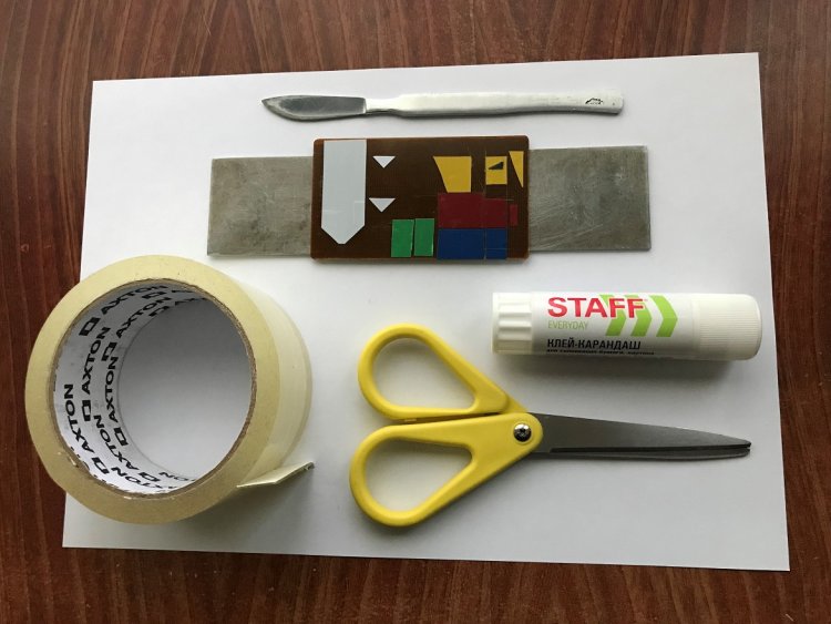 на этикетку можно наложить ровный груз. Потенциометр RP1 «Яркость» можно замаркировать прямоугольным треугольником с углами в 30, 60 и 90 градусов, вырезанным скальпелем по металлической линейке из полоски цветной (жёлтой) изоленты, наклеенной на мягкую (например, гетинаксовую) плату. Скальпель при работе на гетинаксовой поверхности не так сильно тупится, как при работе на стеклотекстолите или стеклянной поверхности. Ровно вырезать треугольник из изоленты простыми ножницами представляется маловероятным. Так как даже небольшая неровность в оформлении портит внешний вид поделки, то пренебрегать такими «мелочами» не следует.