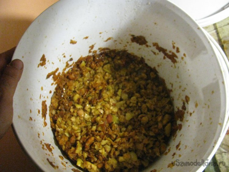 В рецепте говорится, что подойдут любые яблоки, хоть кислые, хоть сладкие, хоть даже дикие. Наша задача - добыть из них сок без соковыжималки. Я насобирал яблок, бросал в ведро и толок дубовой дубиной. Далее для соковыделения нужно добавить сахар, по рецепту положено 150 грамм сахара на 1 кг яблок. Я насыпал 100 грамм, так как яблоки у меня ну полностью сладкие, и не прогадал!
