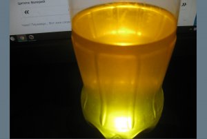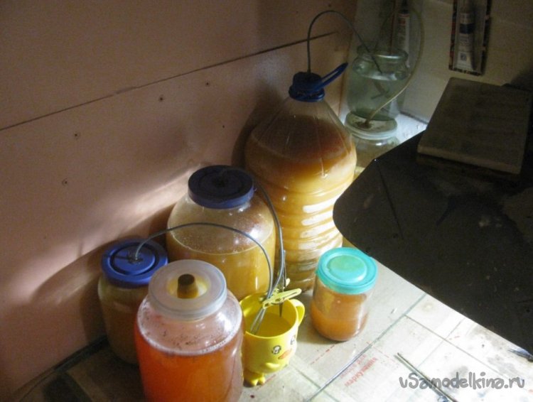 Сделал в крышках гидрозатворы, трубочки сделал из изоляции от проводов, залепив горячим клеем вокруг. Ну что ж, прихожу я на следующий день, а там бурлит! Все бурлит, пузыри идут практически беспрерывно. Но вот что интересно, в пластиковой бутыле на 5л газовыеделение шло сильнее, но я так подумал, что просто объем сока там более, но не все так просто...
