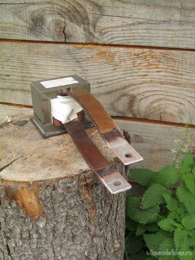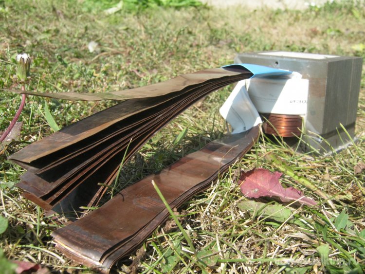 Надо сказать, что громадный ток в сварочной цепи и изрядные потери на самом пустяковом переходном сопротивлении, заставляют иначе взглянуть на конструирование такого аппарата – здесь придется начинать от свариваемых железок. Мой силовой трансформатор перемотан самодельной шиной из медной фольги и имеет значительный выпуск концов (Фото 2).