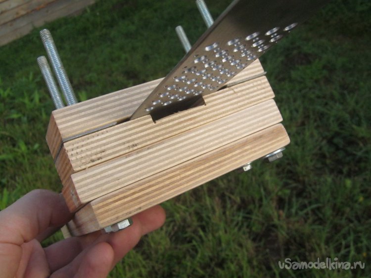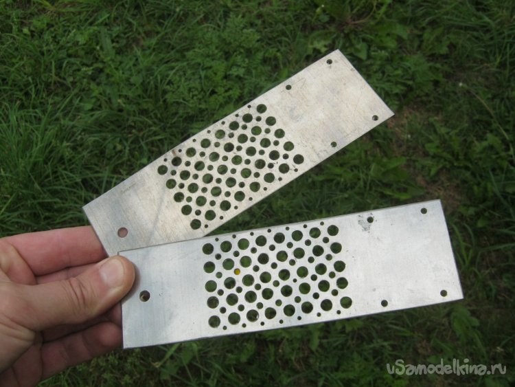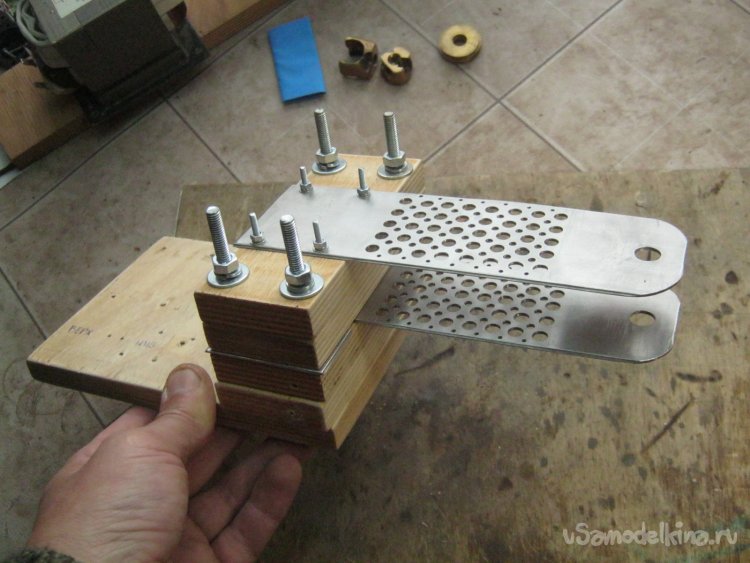 Собрав их концы бутербродом через нетолстый деревянный обрезок и зафиксировав на краю стола струбциной получил импровизированный макет прижима. Оценил жесткость заготовок при сжатии их свободных концов на рабочие ~10…15 мм. Оказалось жестковато. Пластины ослабил периодической перфорацией в средней части (Фото 4…6).