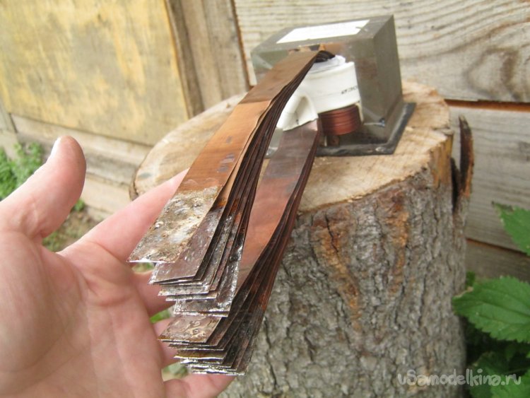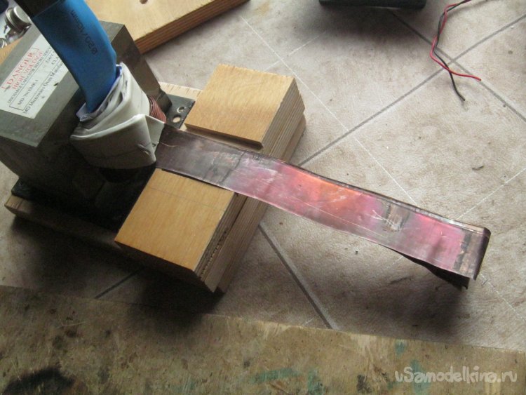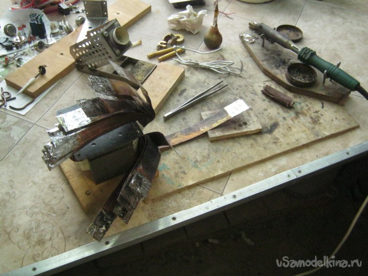 Фото 12. Лужение концов каждой ленты. Пристроил поудобнее тяжелый трансформатор, отогнул и при необходимости фиксировал, мягкой медной проволокой, ненужные выводы. Ленты по одной выравнивал на деревяшке и зачищал наждачкой. Лудил паяльником, ПОС-61 со спиртоканифольным флюсом. Каждую с обеих сторон.