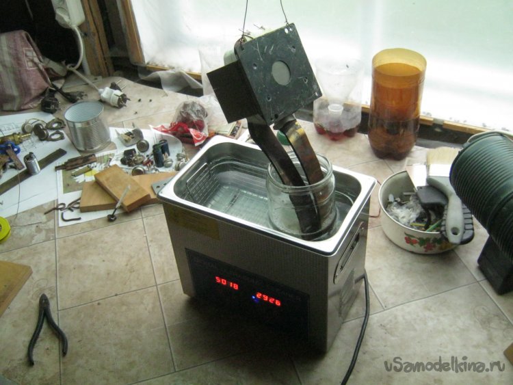 Фото 14. Отмывка остатков спиртоканифольного флюса в УЗ мойке. Трансформатор пришлось подвесить над ванной. Несколько получасовых циклов, потом еще несколько в свежем растворе .