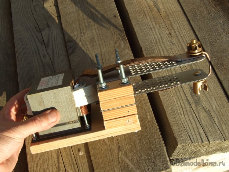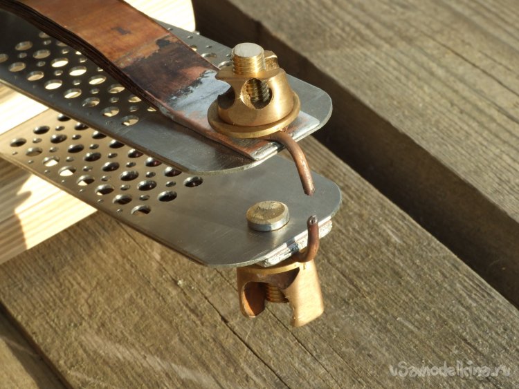Сборка узла проста – в стойку (Фото 11) установил трансформатор с подготовленными выводами (Фото 15), разметил, просверлил отверстия и закрепил его винтами М4 к подошве стойки. Клеммы с гибким пластинам закрепил самодельными латунными болтами М10 предварительно их доработав – укоротил и выровнял на точиле основание-шляпку, укоротил ювелирным лобзиком длину резьбовой части. Здесь, они не токопровод, но простой прижим. Латунь удачно сочетается (не гальваническая пара) с медью.