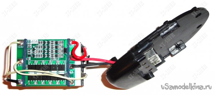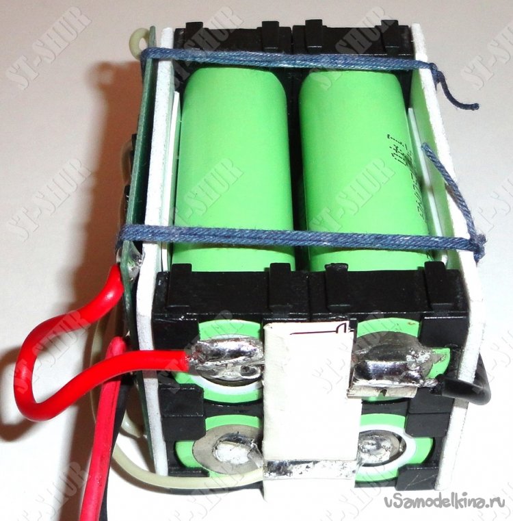 Корпуса китайских АКБ оказались очень удобными для получившейся Li-ion сборки. К сожалению точечной сварки, у меня пока нет. Поэтому сборку Li-ion батареи пришлось осуществлять с помощью пайки. Так же были использованы пластиковые держатели для аккумуляторов, комплекты которых между собой склеены с помощью обрезков пластика. Плата BMS была зафиксирована с помощью достаточно прочной нити. Батарея собрана по схеме 4S1P с балансировкой.