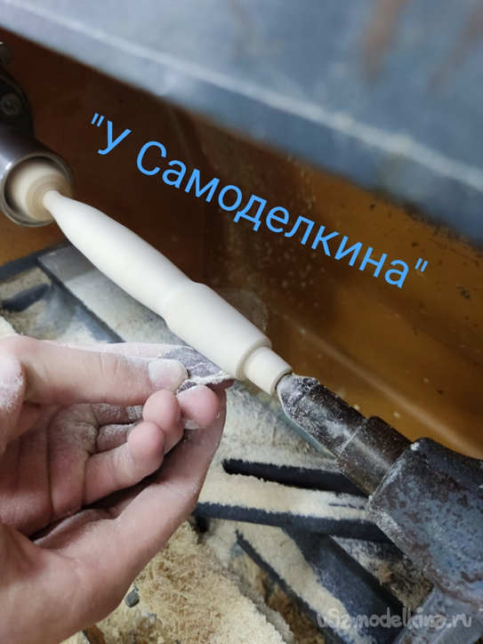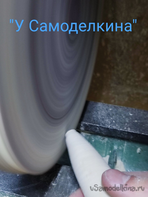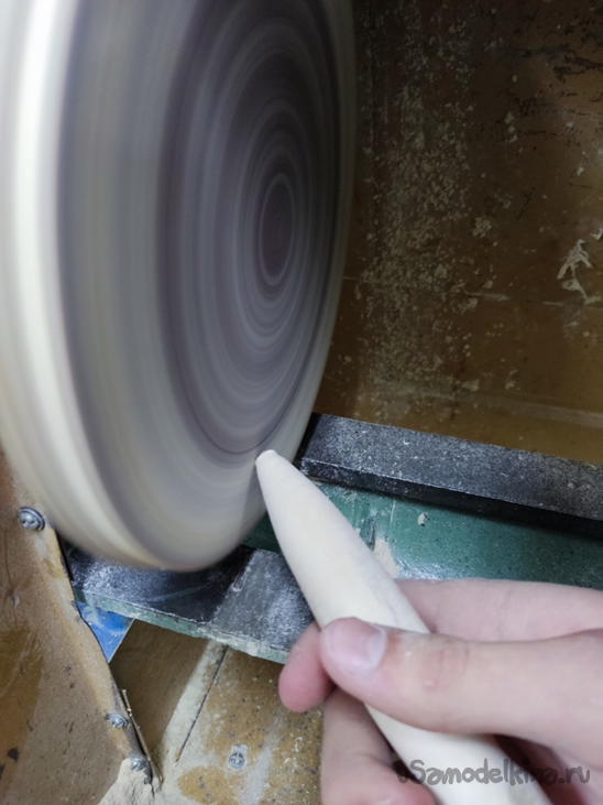 7 Финальный этап. Ослабив гайку, отодвигаем заднюю бабку и выкручиваем изделие из патрона. Далее отпиливаем лишние края. Ставим на станок шлифовальный круг и закругляем спил. Можно, конечно, и в ручную, если не жалко времени.