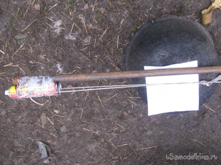 Взял я трубу нужной длины, чтобы достать до них с улицы. Примотал баллон скотчем, а нажим производится при помощи веревки петли из проволоки. Жахнул на чердак и гнездо, произошло все примерно аналогично.