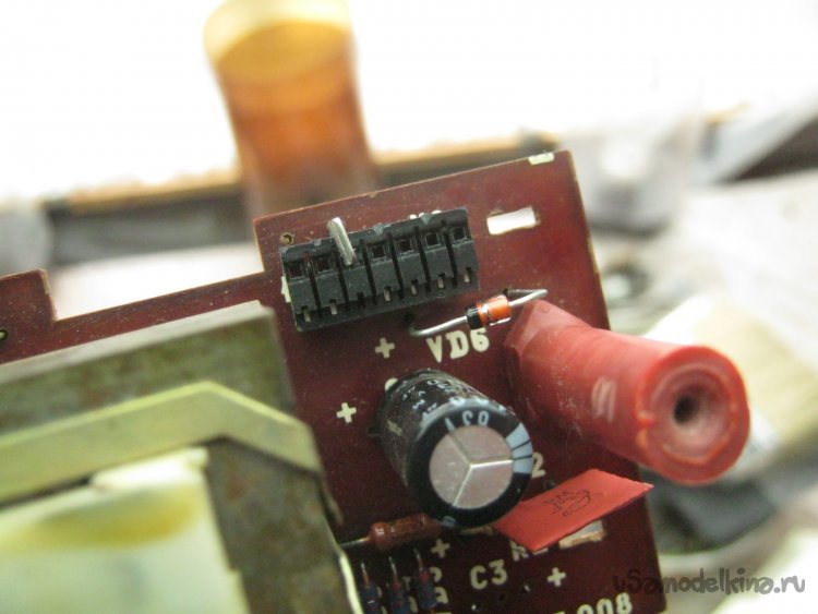 Новые элементы удалось разместить на свободном месте в модуле питания, диод расположился со стороны проводников, токоограничительный резистор применил SMD в корпусе 1206 (Фото 10).