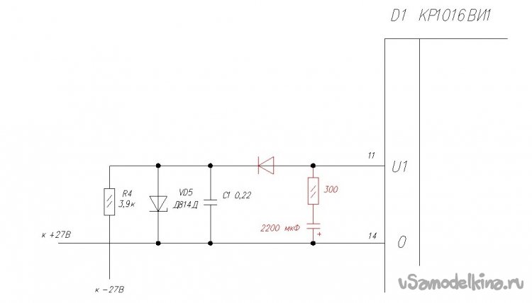 Рис. 9. Фрагмент схемы типового включения КР1016ВИ1 [2] с доработкой. Красным цветом указаны дополнительные элементы, где – диод любой маломощный, лучше Шоттки.