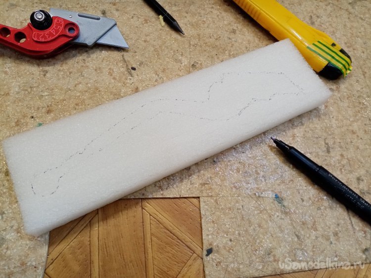 Пошарился по углам, нашел приличный кусочек. Отрезаю заготовку. Укладываю нож и размечаю контур фломастером.