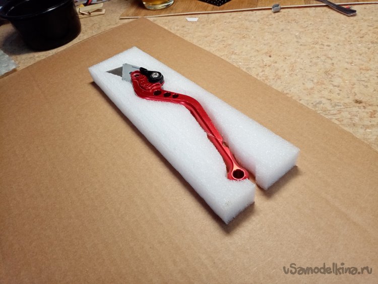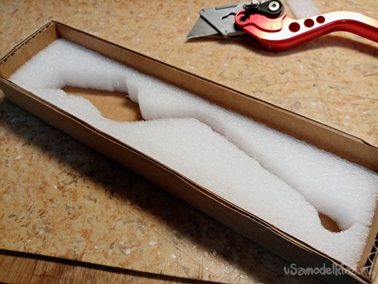 Укладываю внутрь коробочки ложемент, нужно подрезать внешний контур поролона, с таким расчетом, чтобы плотно зажал нож. После нескольких операций по резке. Все удалось. Нож хорошо фиксируется.