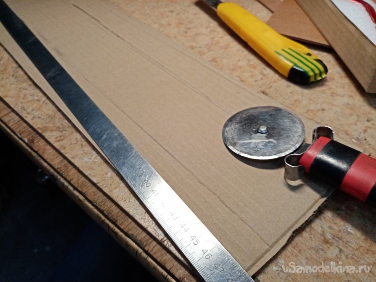 По линейке осторожно прокатываю линии сгиба. Важно не прорезать картон насквозь.