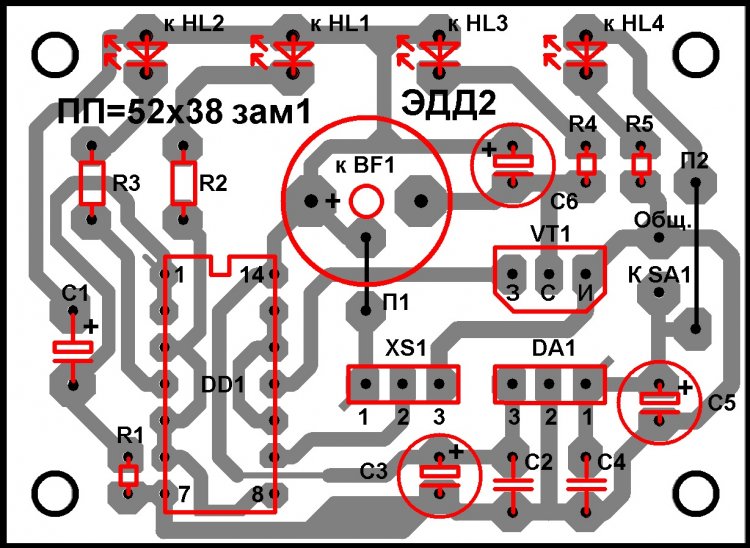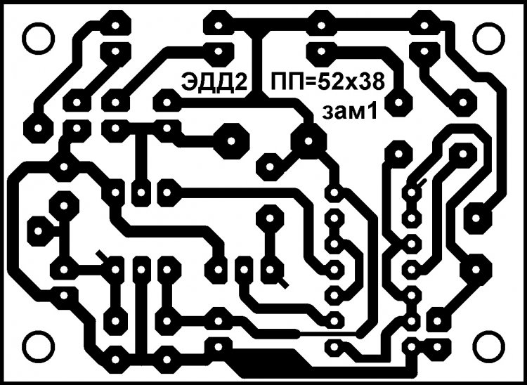 Печатная плата (далее просто ПП) ЭДД2 выполнена из односторонне фольгированного стеклотекстолита размерами 52 х 38 х 2 мм (см. рисунки 2 и 3). Диаметр отверстий под ИМС - 0,7 … 0,8 мм, под остальные радиоэлектронные компоненты – 0,7 … 0,9 мм, под соединительные проводники - 1…1,2 мм, под крепёжные винты – 3,1 … 3,2 мм.