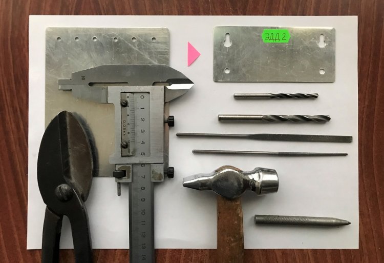 Так как корпус ЭЭД2 сделан из мягкого полиэтилена, то ушки для навешивания поделки на стену лучше сделать из более твёрдого материала – листового дюралюминия толщиной 0,5 мм. Материал такой толщины легко разрезается ножницами по металлу.