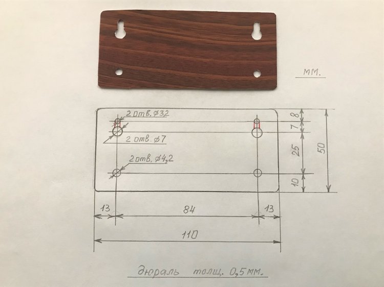 Планка с ушками. После сверления отверстий, ушкам придаётся нужная форма растачиванием (до красных линий) с помощью плоского надфиля. После изготовления, планка обклеивается самоклеящейся плёнкой с одной стороны. Отверстия восстанавливаются (протыкаются) однонаправленными движениями круглого надфиля. Затем планка обклеивается с другой стороны. И снова выполняется восстановление отверстий также однонаправленными движениями круглого надфиля. При другой методике плёнка может оказаться повреждённой.
