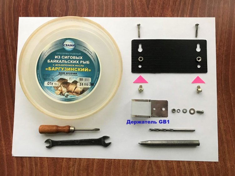 Держатель для аккумулятора GB1 сделан из белой жести толщиной 0,5 мм. Левое отверстие в держателе – под винт М3х6. Правое отверстие в держателе – под винт М4, вкручивающийся в центральную бонку.