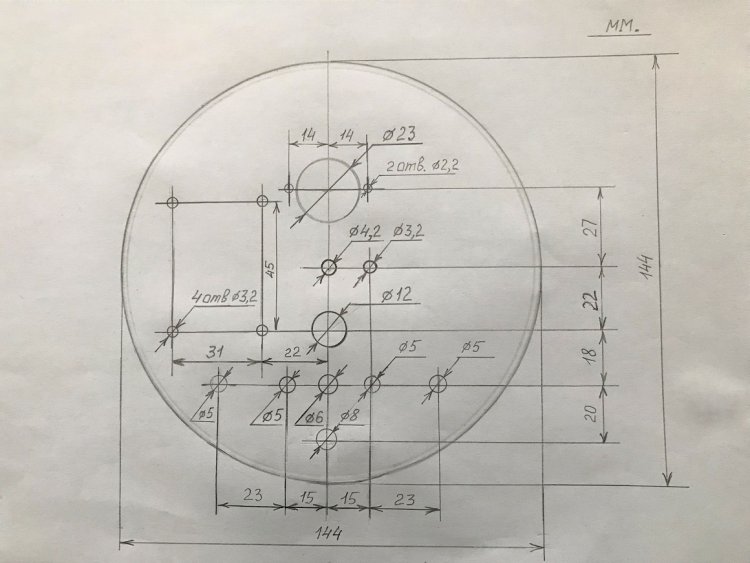 Отверстия D = 2,1 мм; 3,2 мм; 4,8 мм – сверлятся, а отверстия большего диаметра вырезаются ножницами с полузакруглёнными концами (лезвиями). Предварительно окружности - линии разреза намечаются на полиэтиленовой крышке корпуса чертёжным циркулем с двумя иголками.