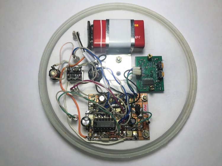 Плата ЭДД2 устанавливается в пластмассовом корпусе (банке из-под рыбных пресервов), имеющем форму, приближающуюся к цилиндрической с габаритными размерами: диаметр 144 мм. и высота 25 мм.