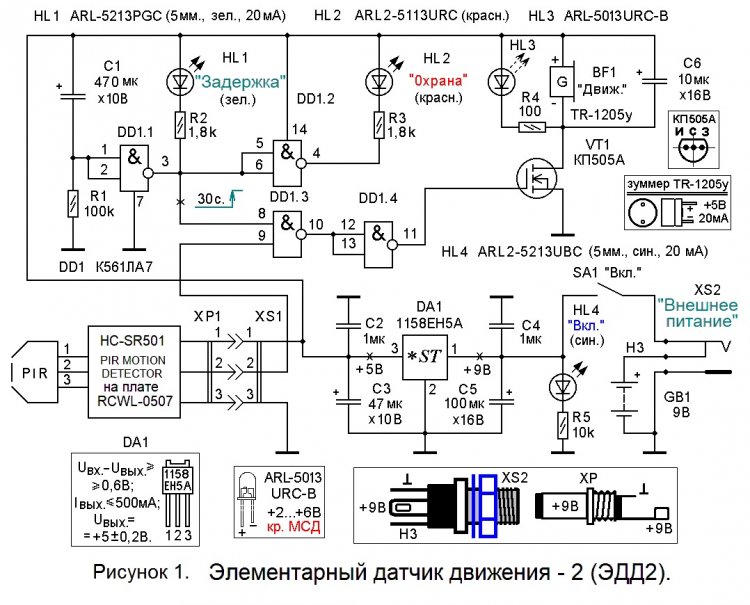 Элементарный датчик движения - 2 (далее просто ЭДД2) является устройством, предназначенным для работы в качестве охранно- предупреждающего устройства. Сердцем этого устройства служат малогабаритные готовые модули – ДД (Датчики движения) HC-SR501 PIR MOTION DETECTOR.