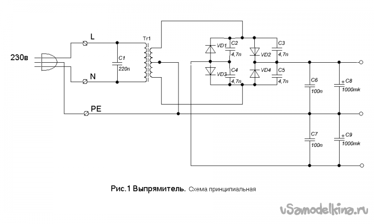 Конструктивно БП сделан из двух платок – платы выпрямителя и платы стабилизатора. Принципиальная электрическая схема платок показана на Рис.1 и Рис.2.