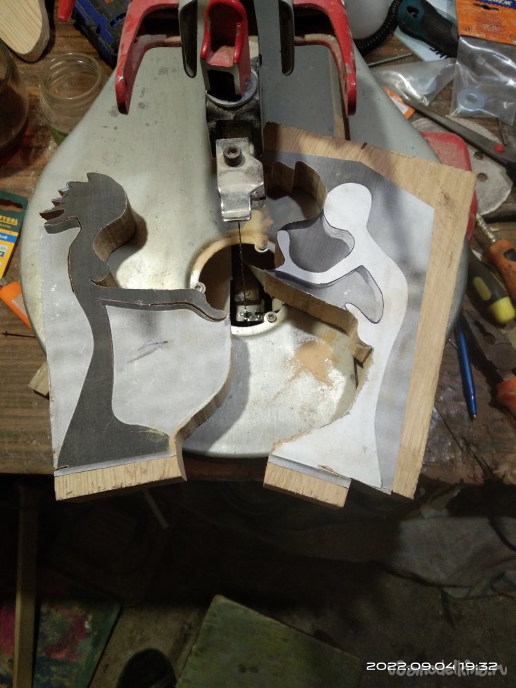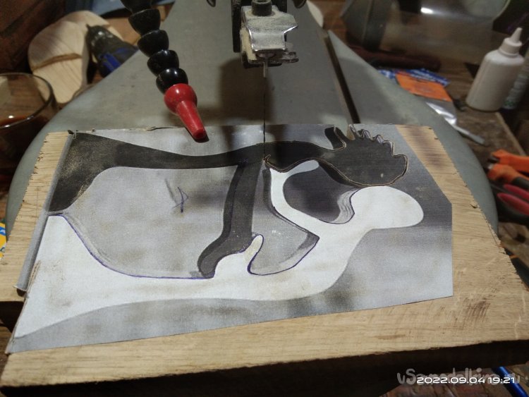 Для данной работы был приобретен обрезок дубовой доски толщиной 20 мм. Электрорубанком убрал все неровности с поверхности, далее шлифовальной машинкой убрал те неровности, которые остались после черновой обработки древесины рубанком. Распечатал на принтере присланную заказчиком картинку и с помощью клея приклеил ее к поверхности доски. Как было сказано выше, работы с таким станком у меня еще не было, поэтому вырезать с помощью обычного полотна такие фигурки я посчитал не очень удобным. Поэтому купил спиральное полотно. Оно отличается от обычного тем, что режущие зубчики есть на всех сторонах полотна, поэтому работать им впервые очень удобно.В итоге выпилил такие фигурки. Для первого раза было нормально. Все неровности были зашлифованы мелкозернистой наждачной бумагой. Так же решил сделать и подставку под эти фигурки, хотя ее мне не заказывали. Она так же изготовлена из дуба.