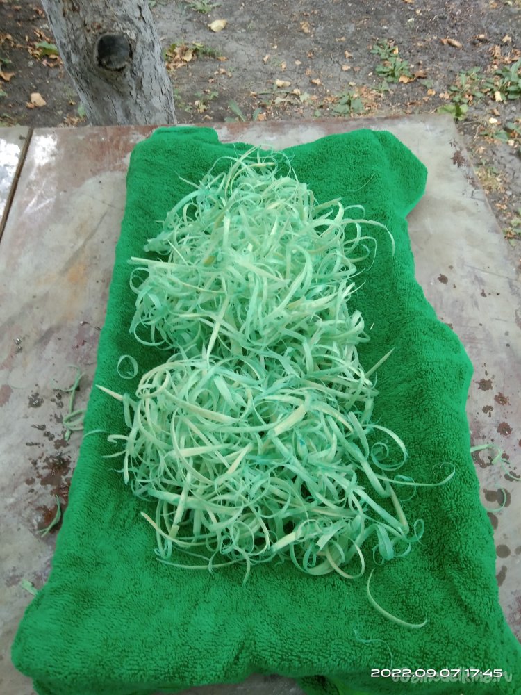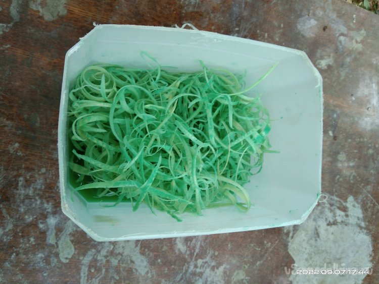 Затем, когда основная и самая трудная часть работы была выполнена, я задумался над наполнителем коробки. Ведь просто так изделия туда не положить, вид при открытии будет совсем не подарочный. Решил сделать аналог деревянного сена, которое продают специально для наполнения коробок. Делать решил из высушенной ветки ивы. Она была достаточно толстой и из нее можно было получить необходимый объем нужного мне материала. После того, как он был получен, наступило время его окрасить. Для этого в небольшом объеме воды я растворил немного акриловой краски зеленого цвета. Уложил в канистру с красителем наполнитель забыл о нем на несколько дней. За это время наполнитель приобрел нежный зеленоватый цвет. Вытащил его из емкости, выложил на полотенце и дал хорошенько просохнуть. Наполнитель готов. По внешнему виду немного отличен от покупного, но зато очень мягкий и на самом деле достаточно бюджетный. Вот так он выглядит.