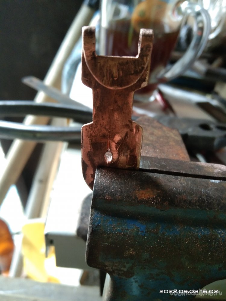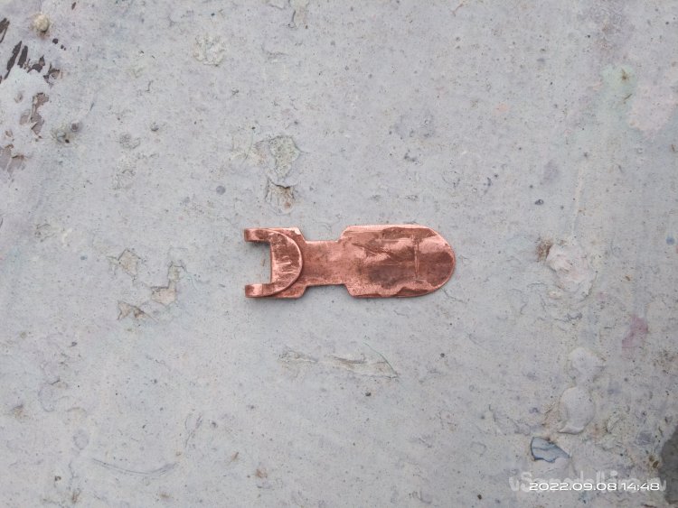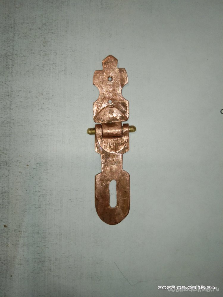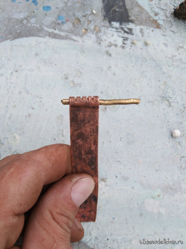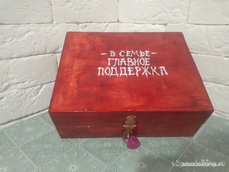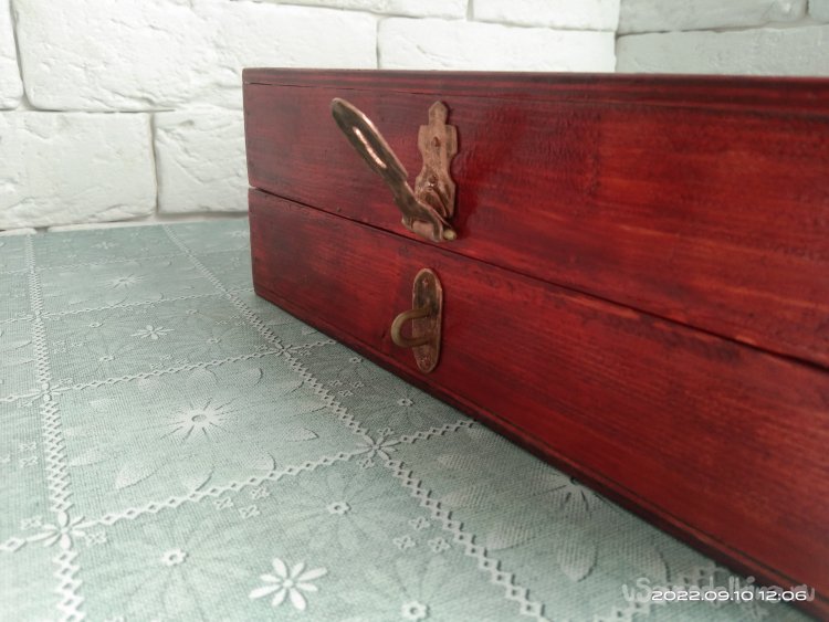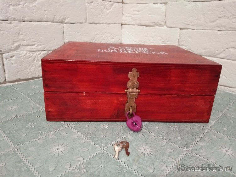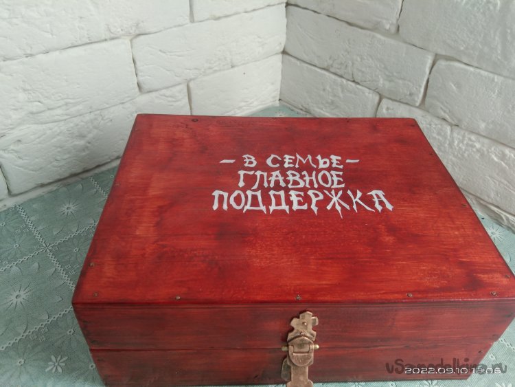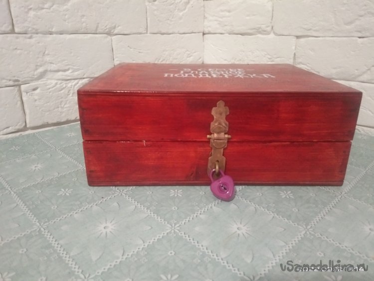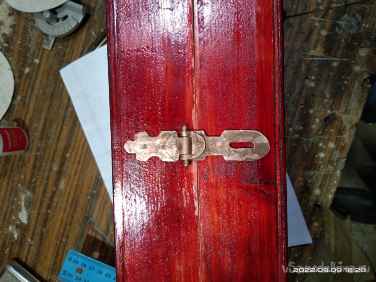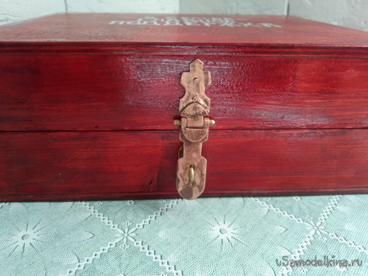 После того, как коробка была собрана, настала очередь подумать о запорном механизме. Купить подходящий мне не удалось, поэтому я решил сделать его сам. Для основы была использована медная трубка, оставшаяся после установки кондиционера. Чтобы она была мягкой и легко поддавалась обработке, с помощью газовой горелки я ее отжег. Разрезав одну сторону трубки, я получил нужную мне по размерам медную пластинку, достаточно мягкую чтобы удобно обрабатывать. Представил себе форму и приступил к изготовлению. Ножницами по металлу придал полукруглую форму одной стороне. Далее, с помощью латунного прутка изогнул эту часть, придав такую форму, чтобы две части щеколды входили друг в друга. Пилой по металлу сделал небольшие прорези в заготовке, а затем вырезал оттуда все лишнее. Получившееся углубление обработал натфилями. Затем начертил на заготовке разметку и ножницами с напильниками придал нужную мне форму. Вторую часть делал аналогично первой, за исключением формы и прорези для ушка. Стержень для щеколды и само ушко для замка было изготовлено из латунного прутка. Высверлил отверстия для крепления к коробке. Саму коробку покрыл лаком в несколько слоев. Наружную часть покрасил в цвет красного дерева, а внутреннюю - бесцветным лаком. Щеколду и ушко закрепил на шкатулке с помощью клея и обмедненных гвоздиков, немного укоротив их до нужного размера. На самой коробке по просьбе заказчика сделал надпись белой акриловой краской -"в семье главное поддержка". Поставил замочек в виде сердца. Получилось очень здорово!
