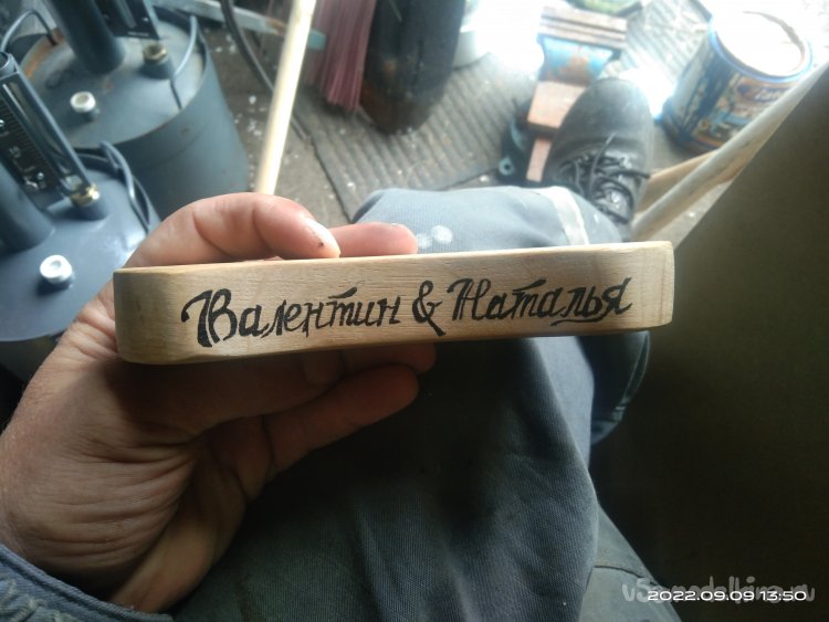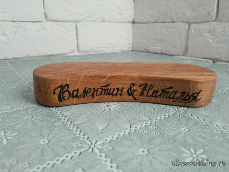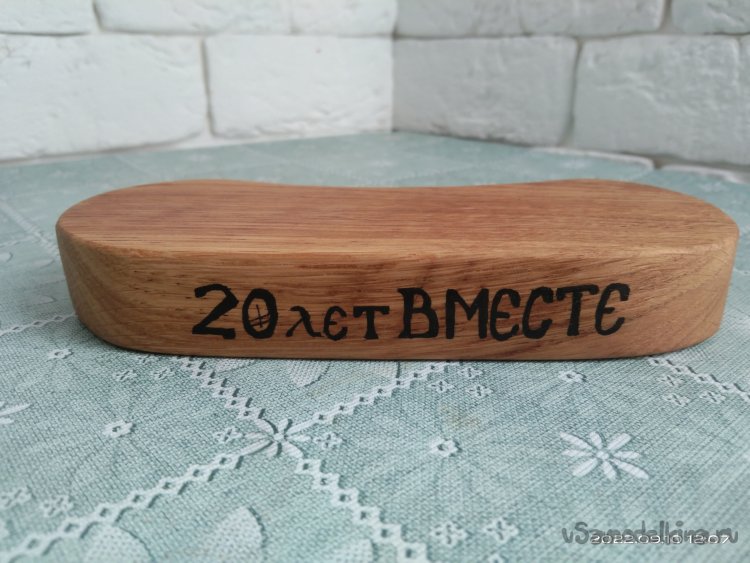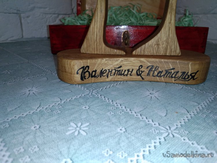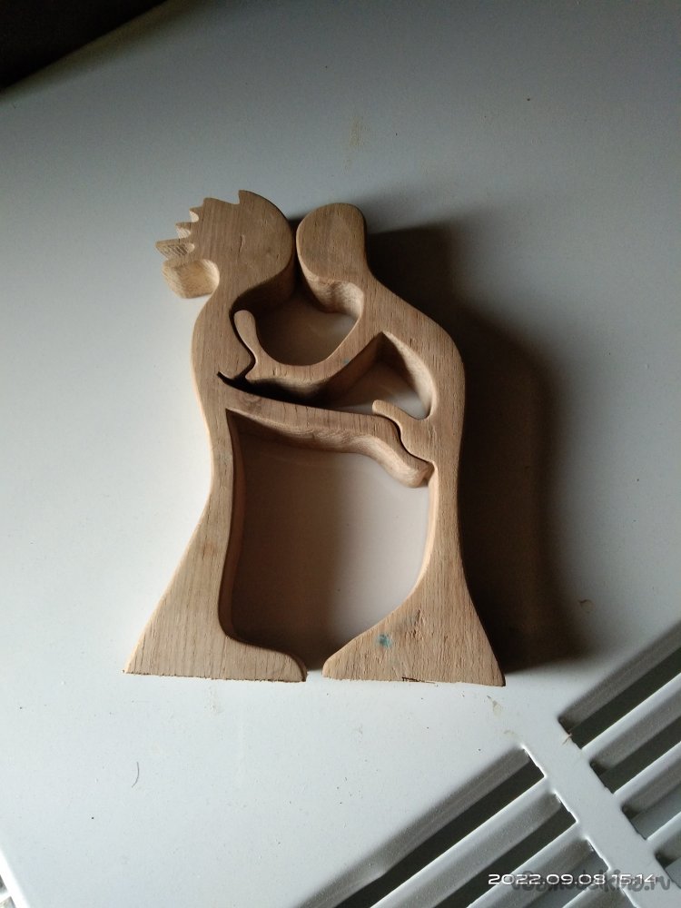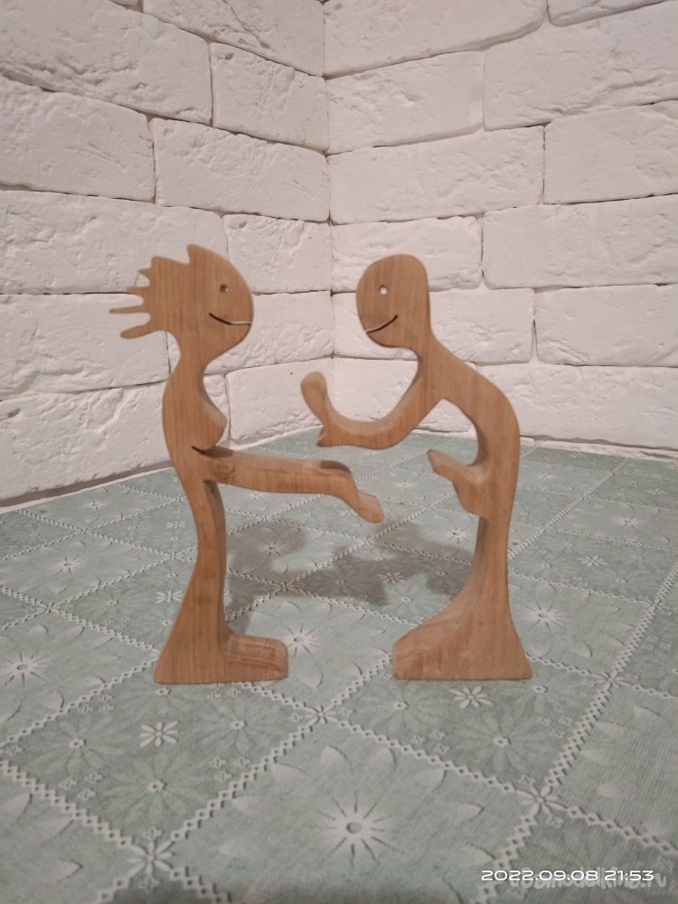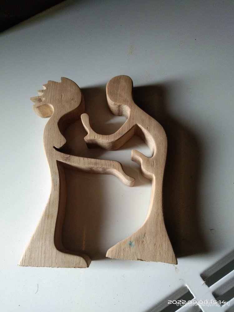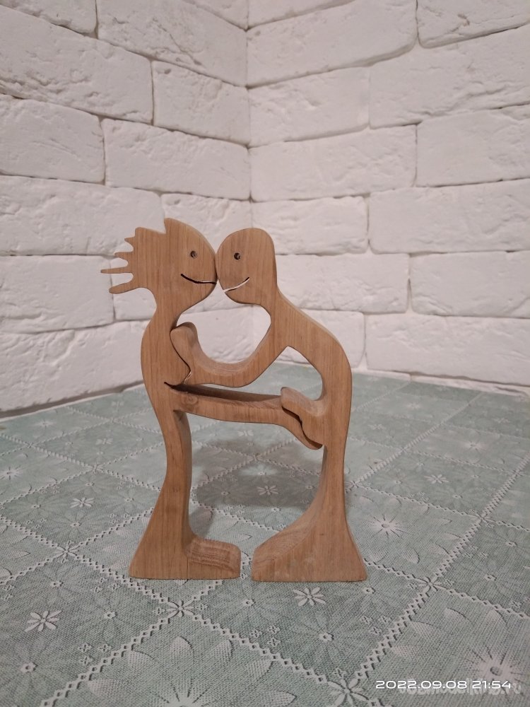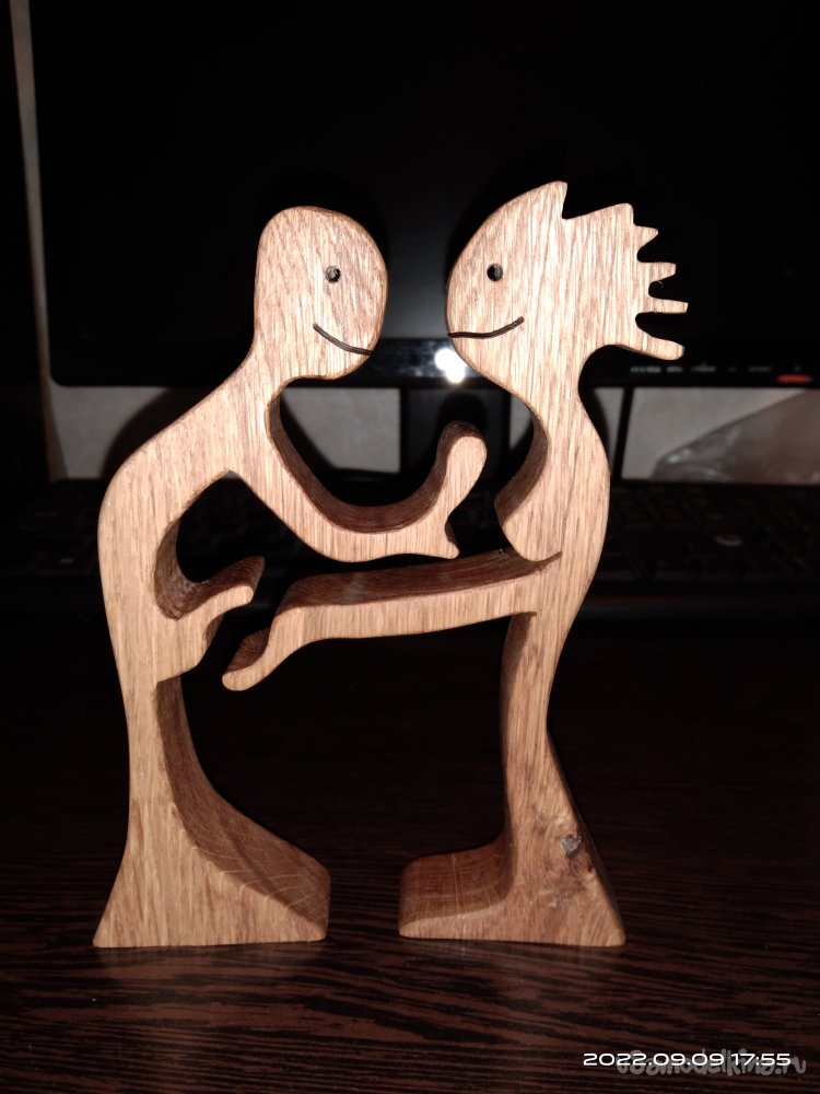 После выпилил подставку и написал на ней черной акриловой краской "Валентин и Наталья". На задней части "20 лет вместе". После на фигурки и подставку нанес масло, чтобы подчеркнуть структуру дерева и придать более презентабельный внешний вид.