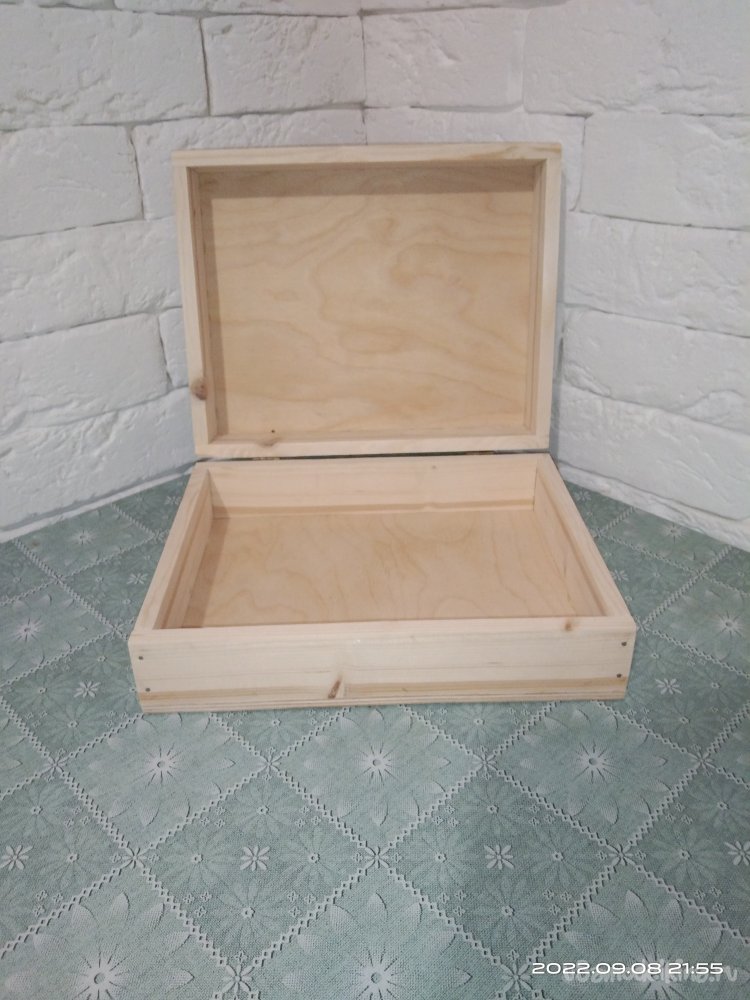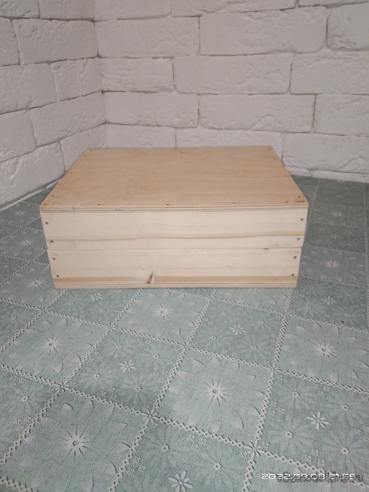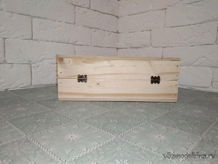 Следующий шаг - изготовление коробки. Она сделана из сосновых реек 40х10 мм. и фанеры 4 мм. Прикинув расположение фигурок и подставки в коробке вычислил ее размеры. По ним выпилил заготовки для дна и крышки. Сосновые рейки так же подогнал по размерам, а углы отпилил под 45 градусов. Собирал все на клей и для большей прочности на мелкие гвозди. Гвозди были еще и как струбцины, которые обеспечили более плотное прижатие фанерных частей к планкам. Установил на обе части маленькие петли для шкатулок. Коробка собрана.