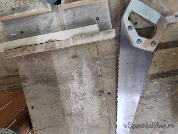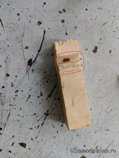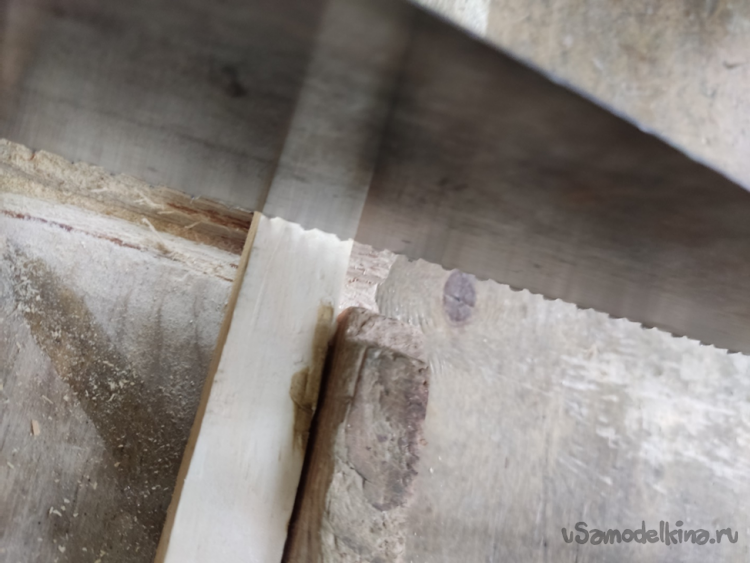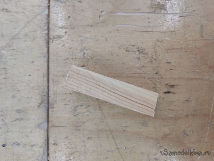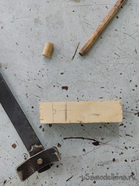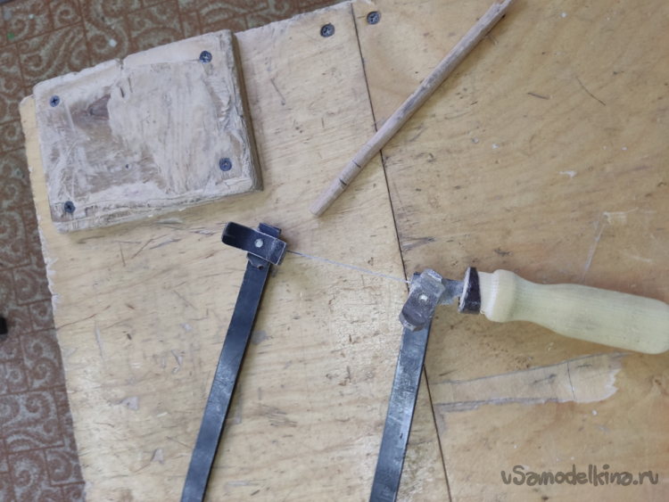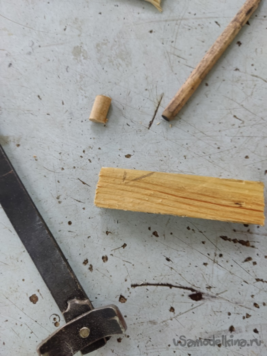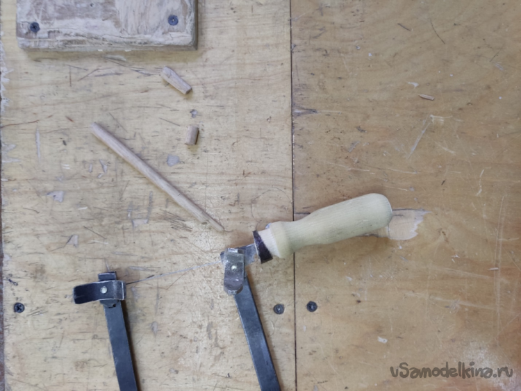 6. При помощи карандаша отмеряем нужную длину на палочке (12 мм +2 мм на припуск) и отпиливаем ручным лобзиком.