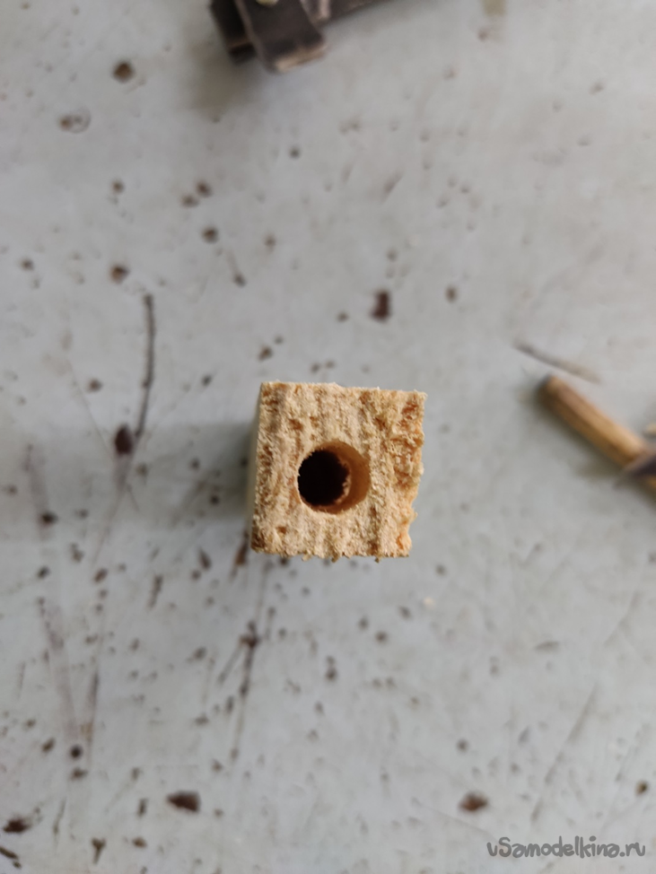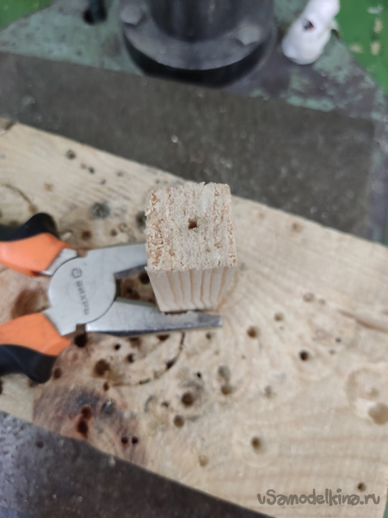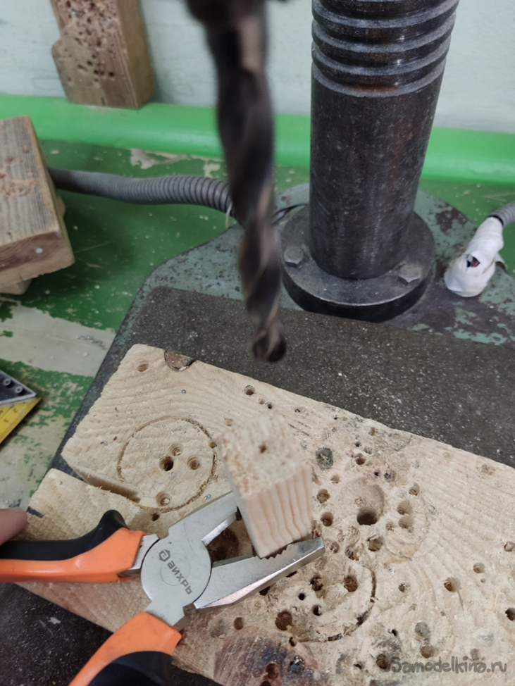 Тем, кто использует шуруповёрт или дрель желательно закрепить брусочек в тиски, при этом в любом случае при сверлении без станка сверло смещается относительно оси заготовки, поэтому необходимо стараться минимизировать угол смещения, иначе можно испортить заготовку.