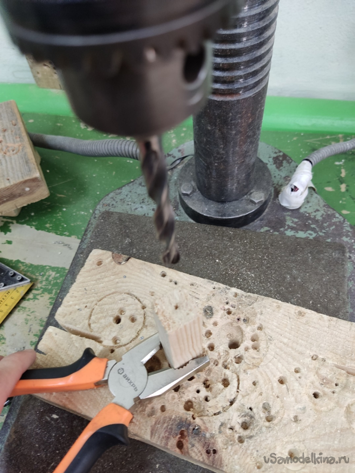4. Закрепляем сверло в сверлильный станок (у кого-то в дрель или шуруповёрт). Производим сверление вертикально вниз, удерживая заготовку плоскогубцами, заглубляемся сверлом на 80мм.