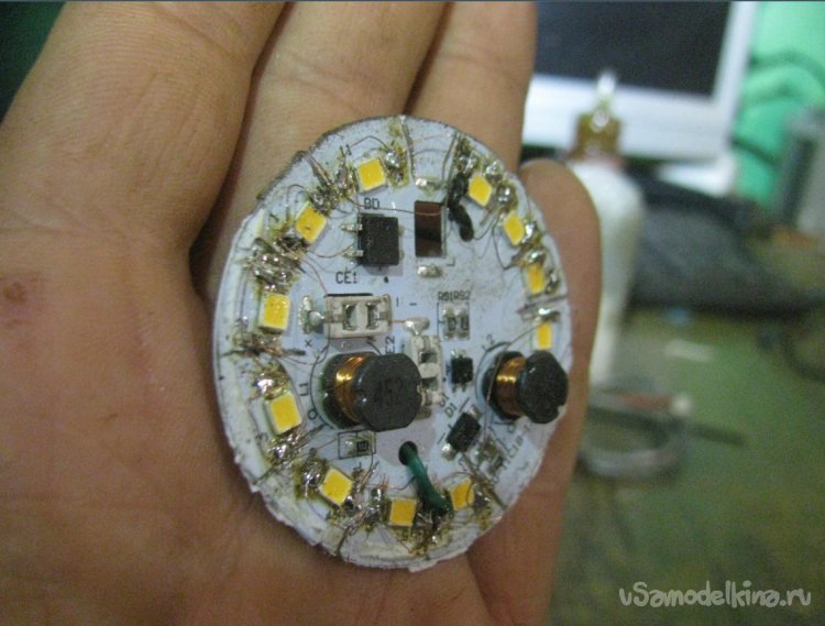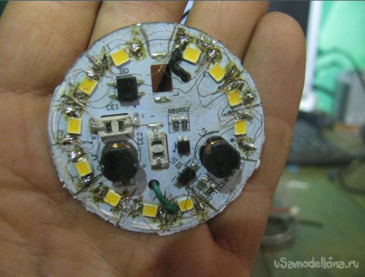 Ну а дальше перерезал дорожки, процарапав до текстолита, спаял светики параллельно «волосками» от провода. Лучше использовать эмалированный провод или обычный тонкий, чтобы не было риска кз.