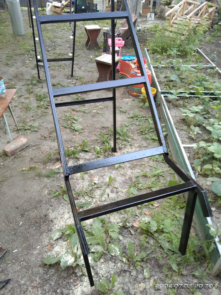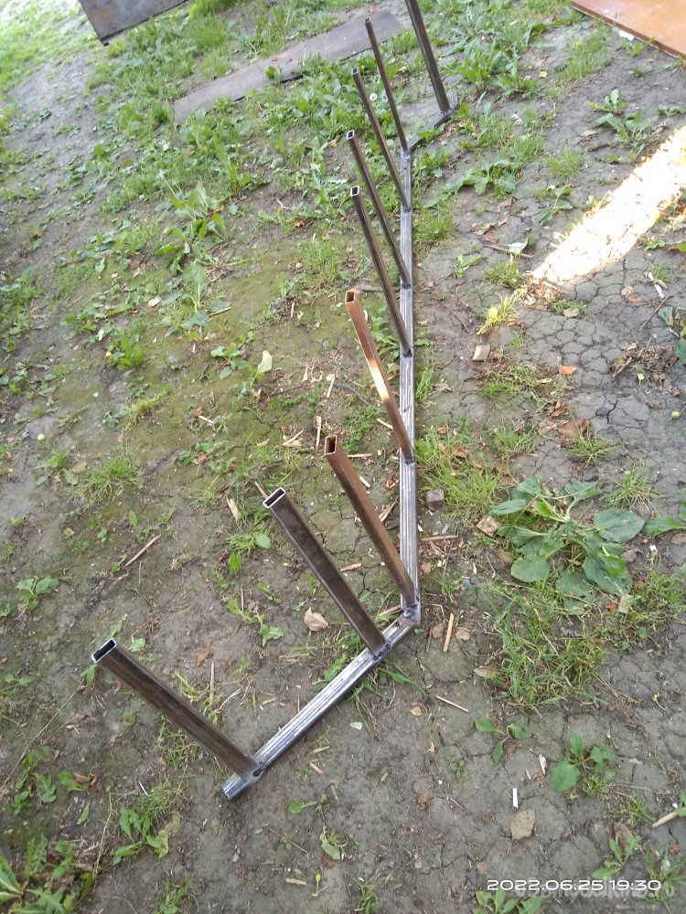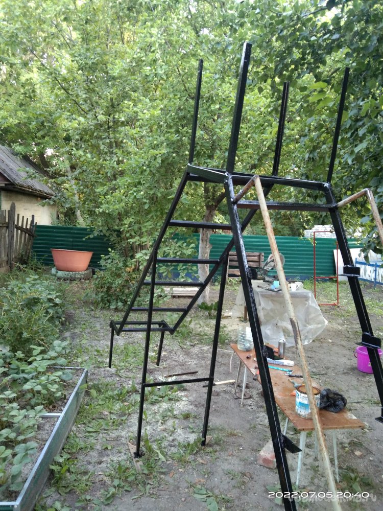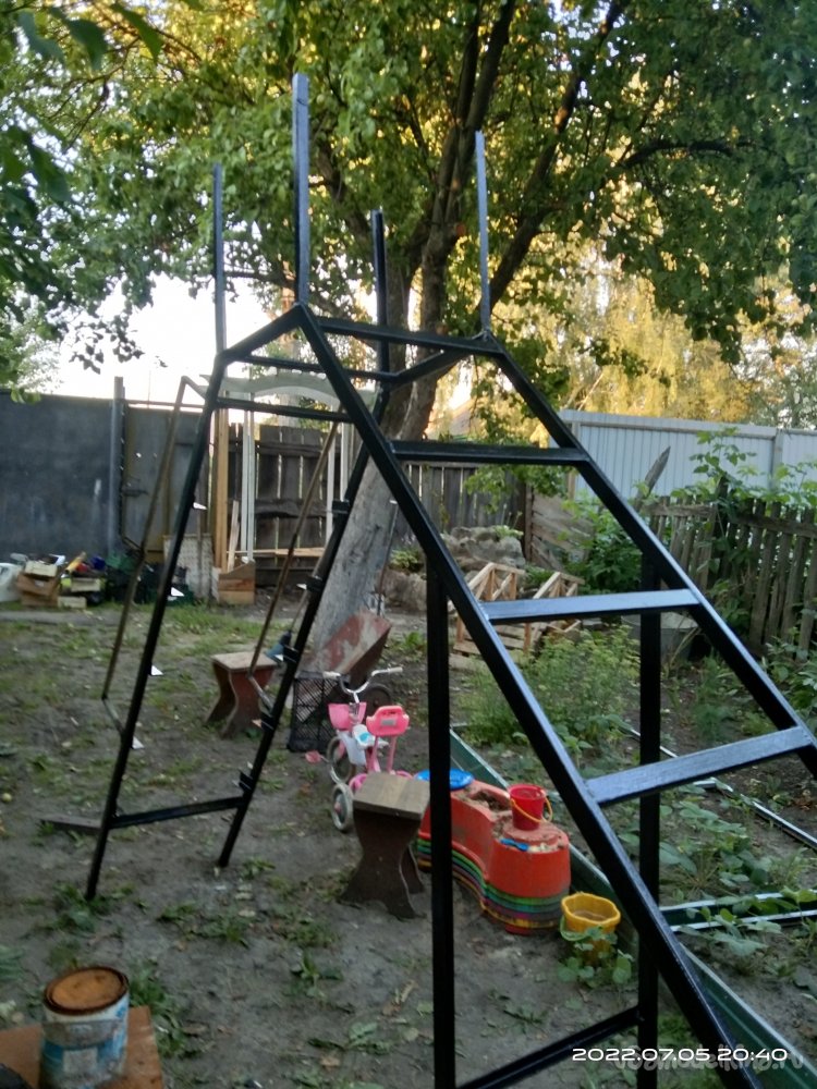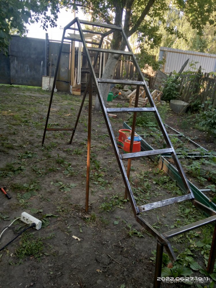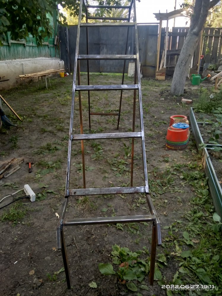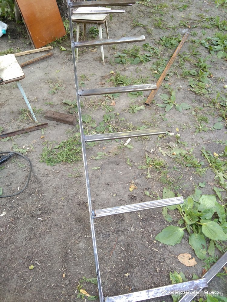 Затем из того же профиля нарезал несколько одинаковых по длине отрезков. Их я приваривал к боковинам горки. Они служат ребрами жесткости всей конструкции и к тому же на эти детали впоследствии будет укладываться лист оцинкованной стали для скольжения. После того как были соединены две боковины поперечными перекладинами, я к этой конструкции приварил ножки. В последствии между ножками для большей прочности приварил перекладины. Вот как все это выглядело на тот момент.