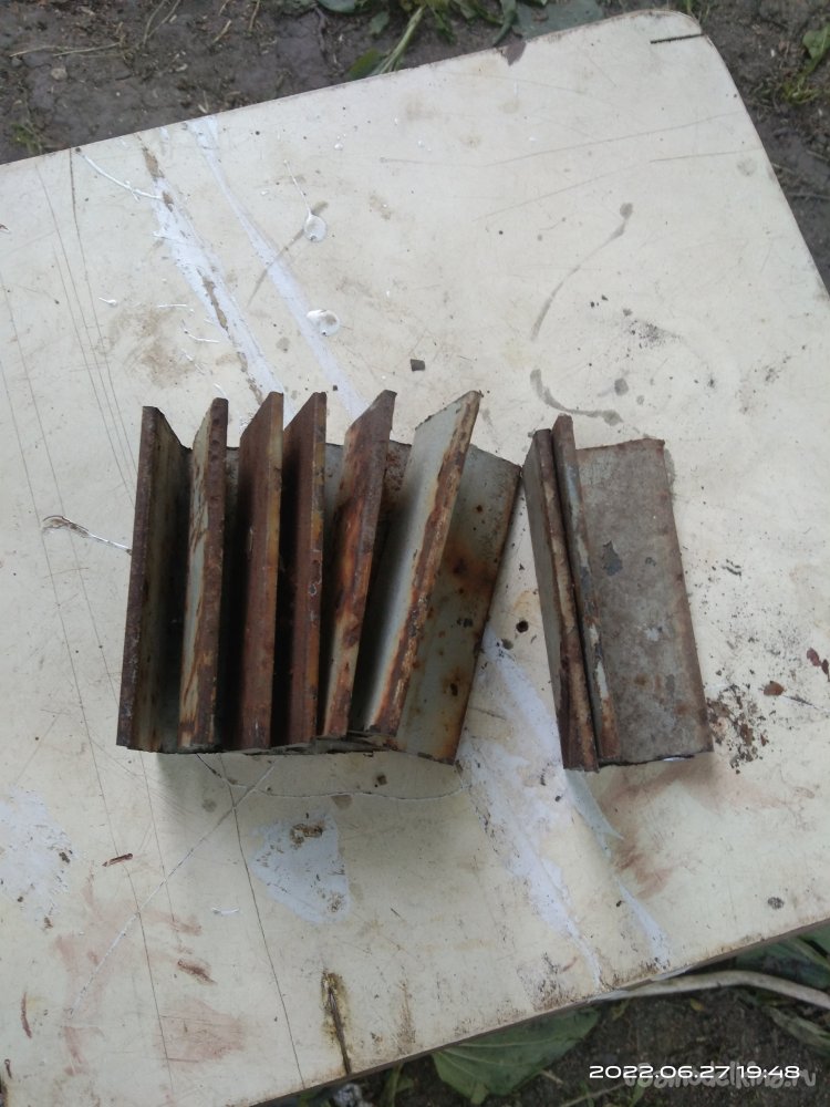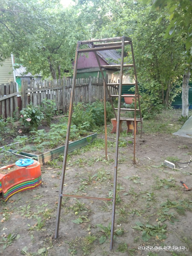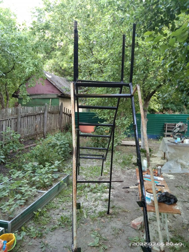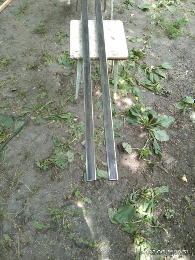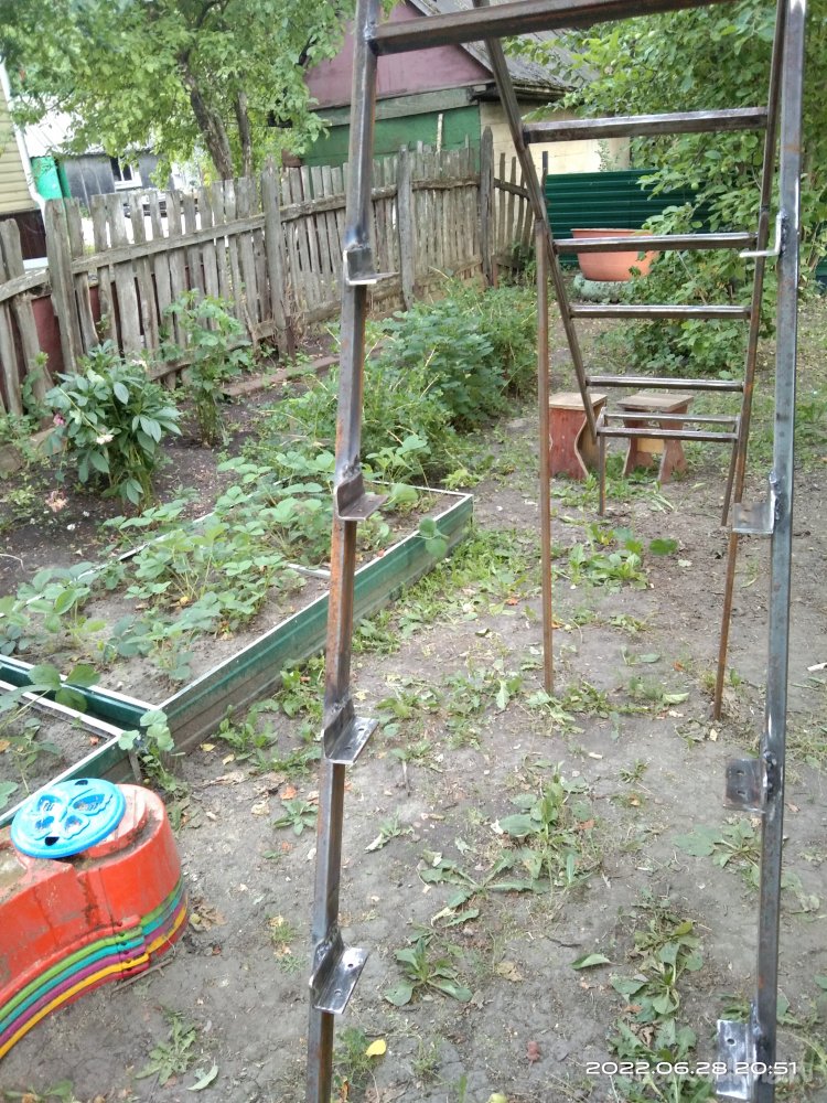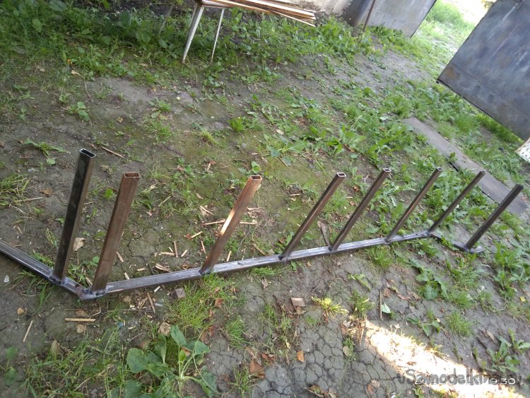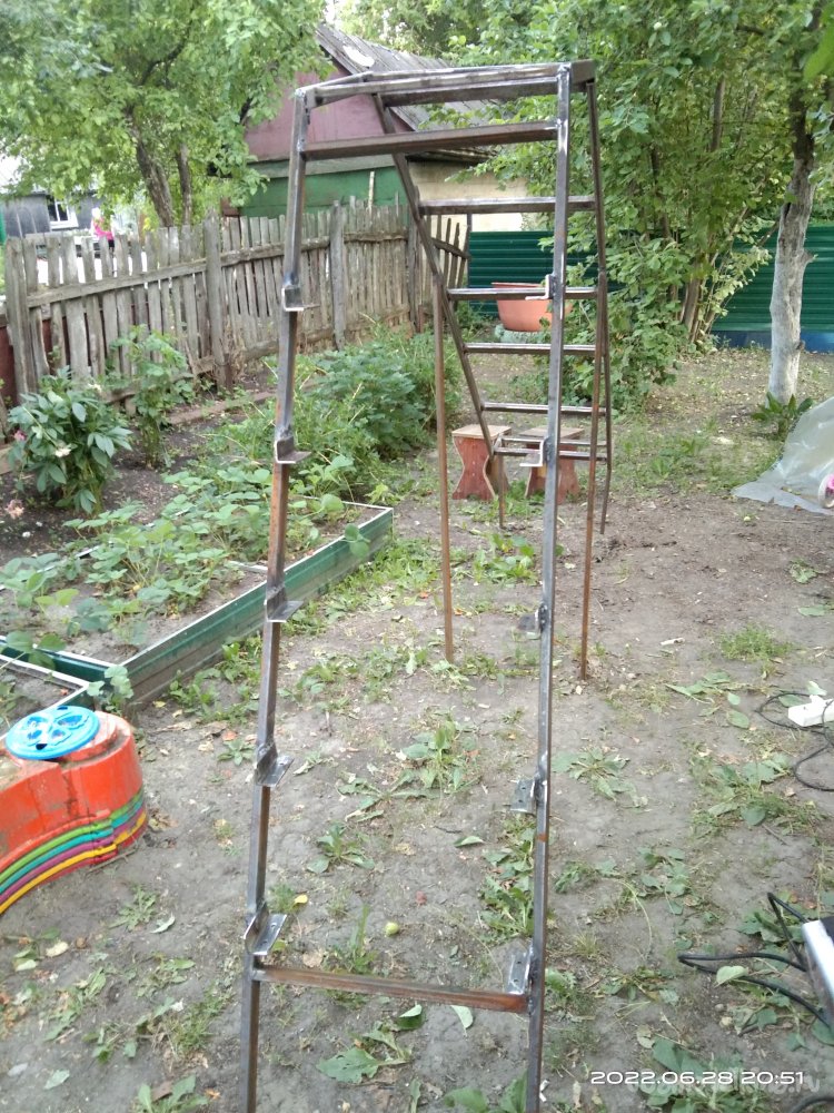 Затем из того же профиля нарезал несколько одинаковых по длине отрезков. Их я приваривал к боковинам горки. Они служат ребрами жесткости всей конструкции и к тому же на эти детали впоследствии будет укладываться лист оцинкованной стали для скольжения. После того как были соединены две боковины поперечными перекладинами, я к этой конструкции приварил ножки. В последствии между ножками для большей прочности приварил перекладины. Вот как все это выглядело на тот момент.