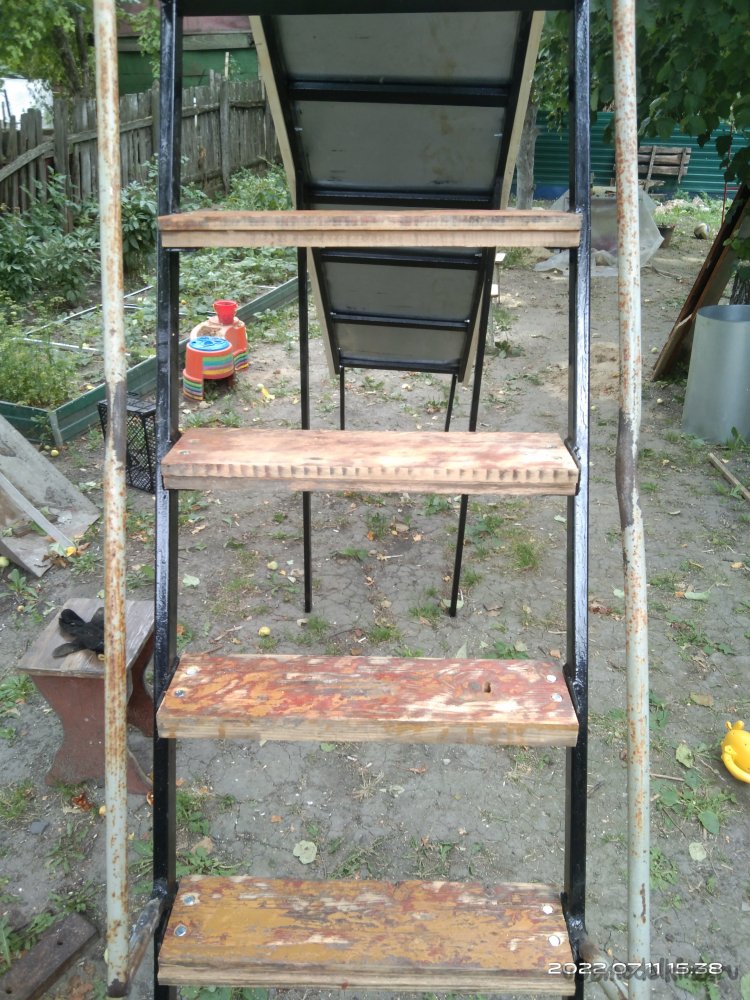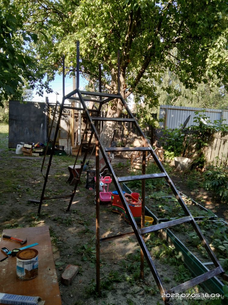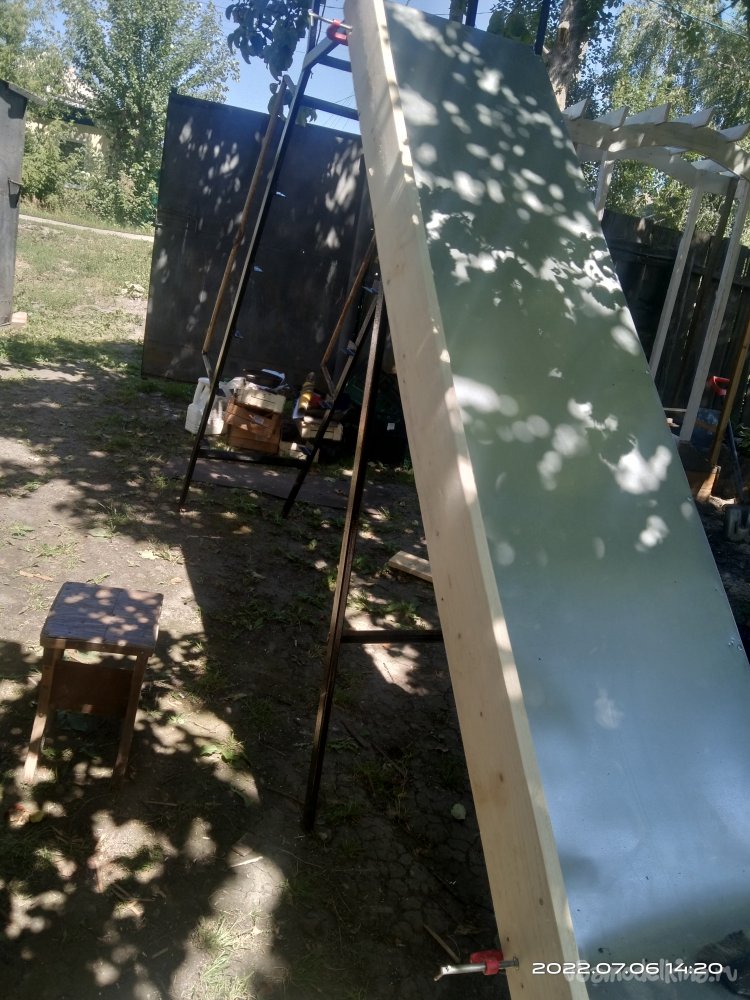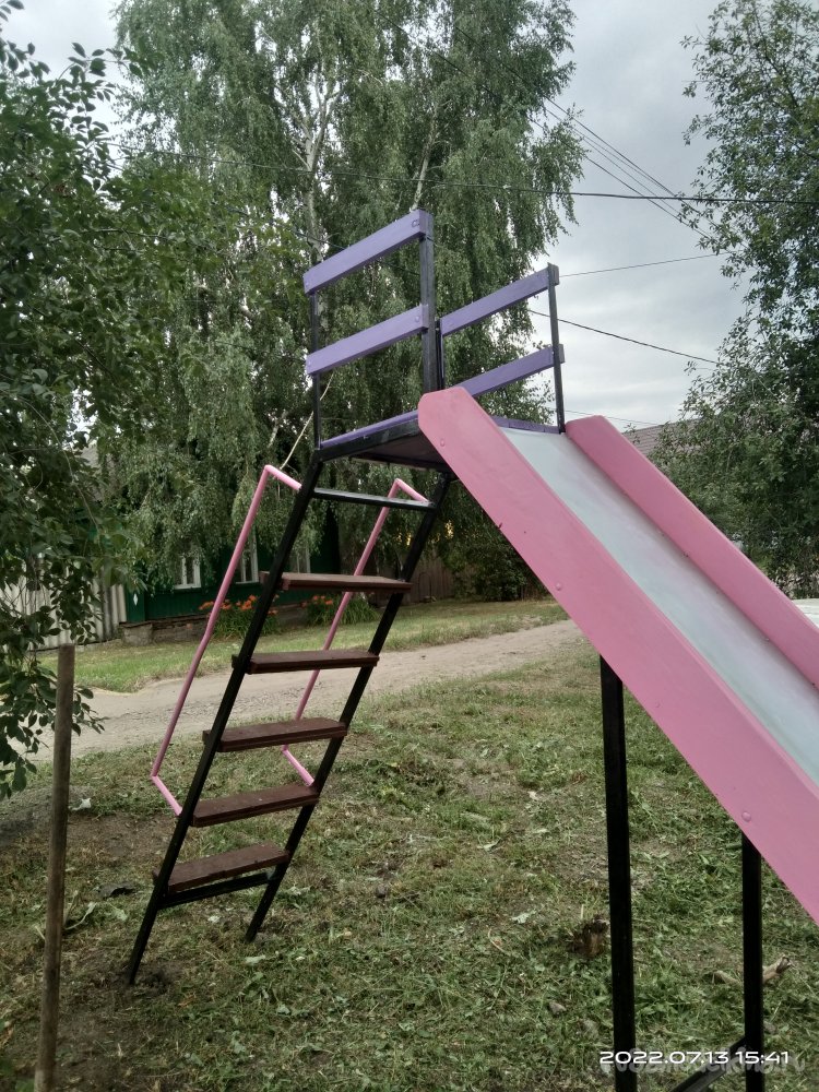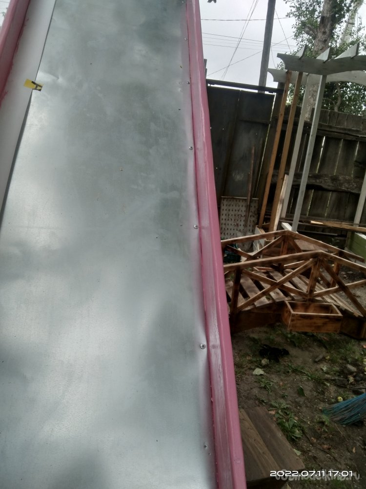 Основная конструкция готова. Теперь нужно сделать скользящую поверхность чтобы можно было скатываться. Для этой цели я купил лист оцинкованной стали и отрезал его по размеру ширины горки плюс по несколько сантиметров с каждой стороны для сгибания. Саморезами закрепил лист на горке, загнув выступающие по бокам края. Для того чтобы ребенок во время скатывания не выпал за пределы горки, установил по бокам бортики. Их я сделал из доски 25х150. С помощью струбцин закрепил ее на горке и сделал нужную разметку. Далее отпилил все лишнее и зашлифовал стороны и торцевую части бортиков. На закрепленных струбцинами к боковинам горки бортикам, высверлил отверстия. Через них в металлических частях горки. Далее болтами прижал деревянные детали к стенкам горки. Получилось достаточно прочно и надежно. Из старых половых досок сделал ступеньки. Отрезал их нужной длины, приложил к опорам и снизу через отверстия сделал разметку для отверстий под болты уже в ступеньках. Прикрутил их к уголкам. На верхней площадке горки сделал перекладины для безопасности. Далее приступил к покраске всей горки согласно цветовой схеме продиктованной мне дочерью. Чтобы не испачкать во время окрашивания бортиков лист оцинкованной стали, наклеил полоски бумаги. Ступеньки покрасил половой краской. На них будет приходиться постоянная нагрузка, а эта краска, как говорит производитель, обладает хорошей износостойкостью.