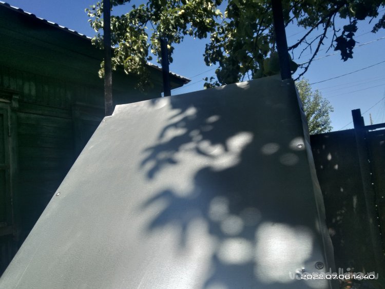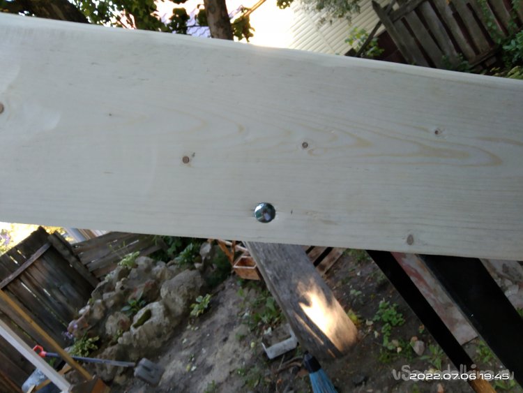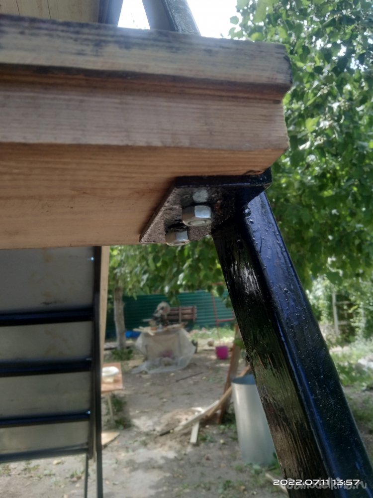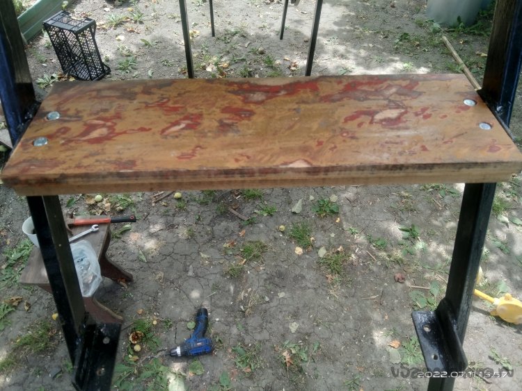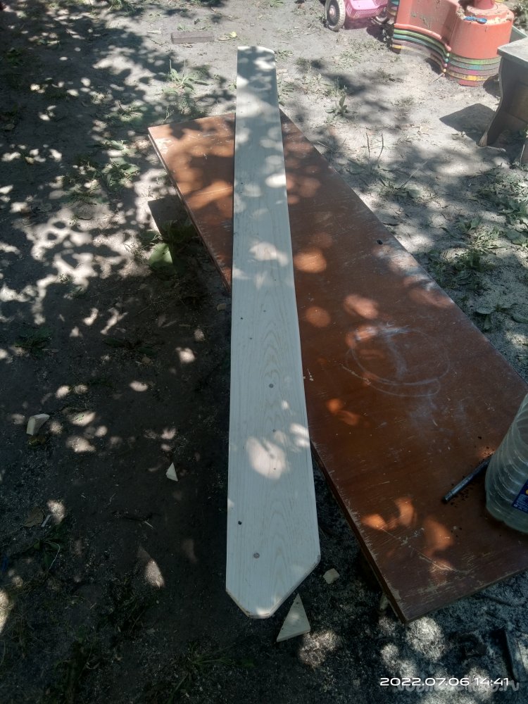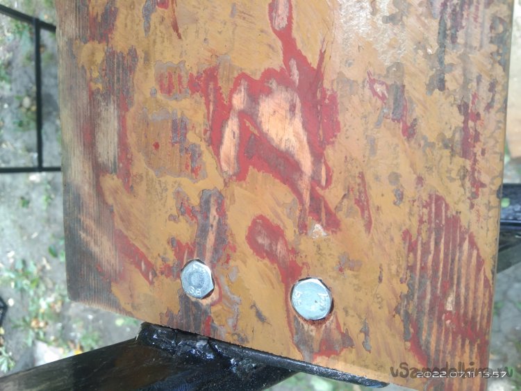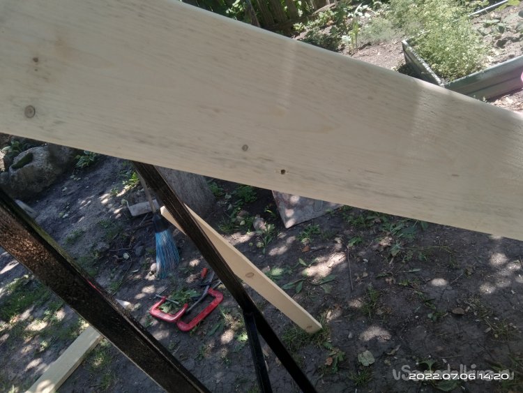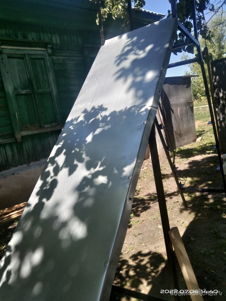 Основная конструкция готова. Теперь нужно сделать скользящую поверхность чтобы можно было скатываться. Для этой цели я купил лист оцинкованной стали и отрезал его по размеру ширины горки плюс по несколько сантиметров с каждой стороны для сгибания. Саморезами закрепил лист на горке, загнув выступающие по бокам края. Для того чтобы ребенок во время скатывания не выпал за пределы горки, установил по бокам бортики. Их я сделал из доски 25х150. С помощью струбцин закрепил ее на горке и сделал нужную разметку. Далее отпилил все лишнее и зашлифовал стороны и торцевую части бортиков. На закрепленных струбцинами к боковинам горки бортикам, высверлил отверстия. Через них в металлических частях горки. Далее болтами прижал деревянные детали к стенкам горки. Получилось достаточно прочно и надежно. Из старых половых досок сделал ступеньки. Отрезал их нужной длины, приложил к опорам и снизу через отверстия сделал разметку для отверстий под болты уже в ступеньках. Прикрутил их к уголкам. На верхней площадке горки сделал перекладины для безопасности. Далее приступил к покраске всей горки согласно цветовой схеме продиктованной мне дочерью. Чтобы не испачкать во время окрашивания бортиков лист оцинкованной стали, наклеил полоски бумаги. Ступеньки покрасил половой краской. На них будет приходиться постоянная нагрузка, а эта краска, как говорит производитель, обладает хорошей износостойкостью.