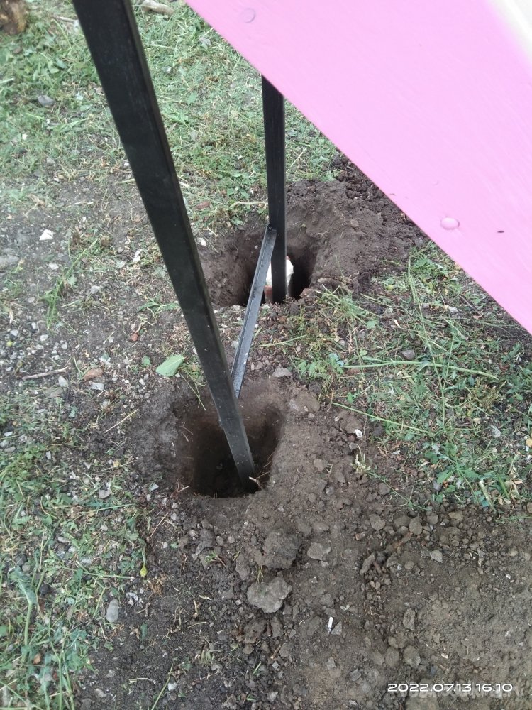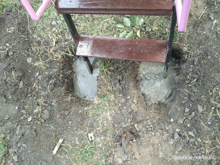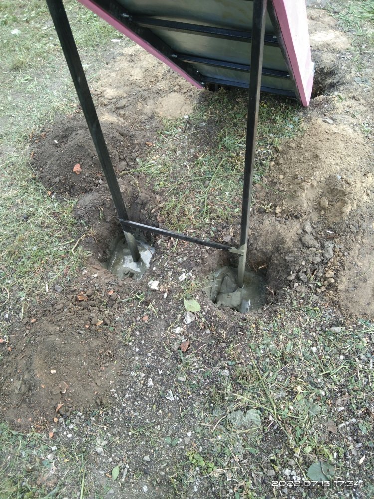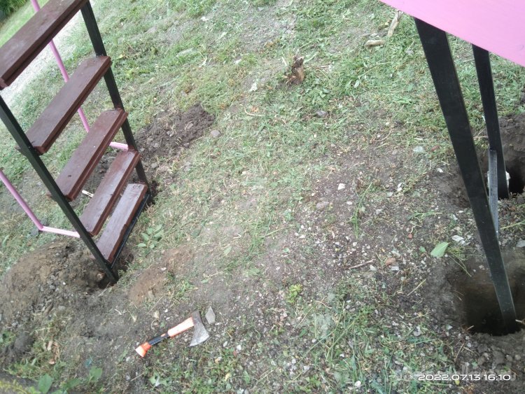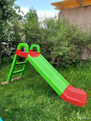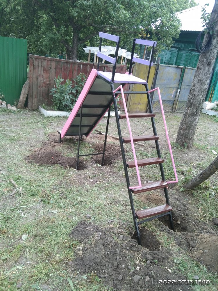Завершающий этап - это установка горки на постоянное место стоянки. Определившись с расположением конструкции на месте, разметил места под ножки, которые нужно будет забетонировать. Выкопал ямы под каждую из ножек. Затем замешал цементно-щебниевый раствор. Установил горку в ямки и выровнял. Далее залил цементную смесь в лунки. Самое трудное, как оказалось, отгонять детей от не застывшей горки. Так и норовили побыстрее опробовать ее в деле. Но, т.к. до вечера времени оставалось немного, а с утра все разъезжаются по детским садам, я с успехом отстоял горку и она смогла как следует застыть. Проверял ее сам. Залез и пару раз с нее скатился. На поверку она оказалась несколько крутоватой и я уже боялся, что придется ее выкапывать из земли и немного переварить, сделать более пологой. Но обошлось. Придя с детского сада дочь сразу же на нее залезла и скатилась. Затем подтянулись и остальные ребята. Началось веселье. Визгу, споров и разборок за очередность скатывания было немеряно!