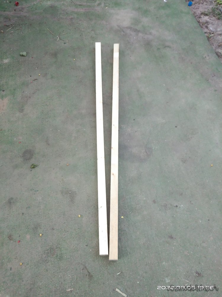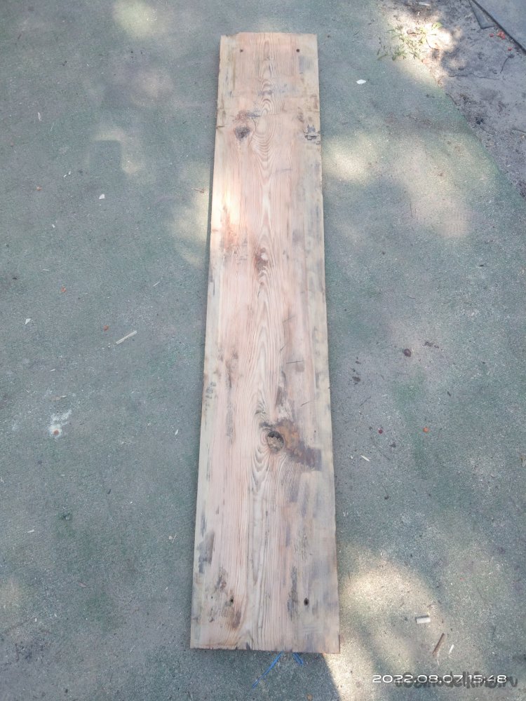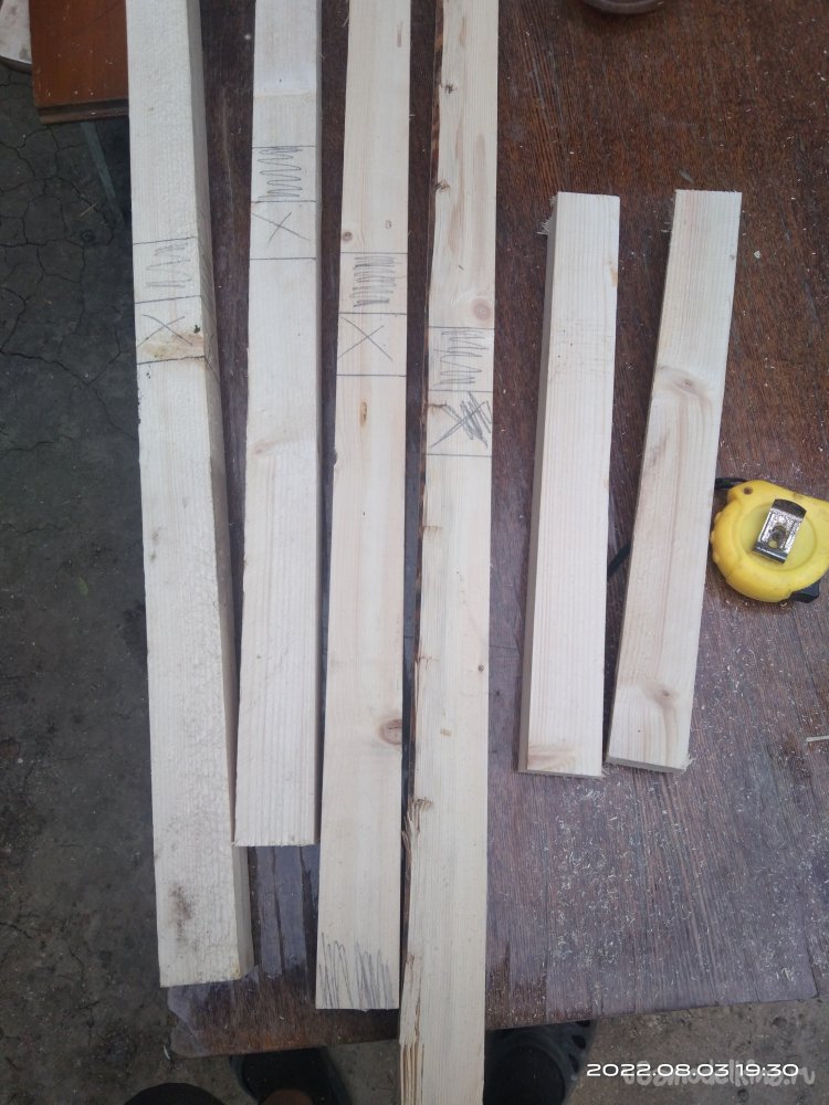 Приступаю к изготовлению посадочной площадки. Изначальный вариант должен был быть из брусьев, но когда я разместил из на поверхности скамьи чтобы выбрать оптимальный зазор между ними, мне не понравилось то, что при маленьких зазорах вид был не очень хорошим, смотрелось как-то убого. При увеличении же зазора сидеть становилось неудобно, в пятую точку врезались края брусков. Конечно их можно было снять фрезерным станком, но я решил что доски подойдут для этой цели лучше. Поэтому взял старые половые доски 40-ка мм толщиной, с помощью рубанка привел их в божеский вид, распустил на циркулярной пиле и установил их. Как мне кажется это просто отличное решение!