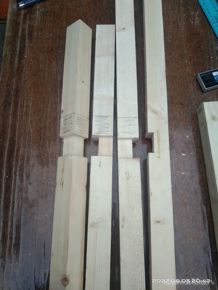 Следует обратить внимание на то, что на некоторых заготовках пазы выбраны сразу на двух сторонах. Получается что он как будто бы сдвоенный. Сделано это для того, чтобы поперечные и продольные перекладины находились на одном уровне и не выбивались из общей картины. Конечно, такое соединение немного ослабит прочность стойки, но не намного. Толщины материала хватит чтобы это компенсировать.